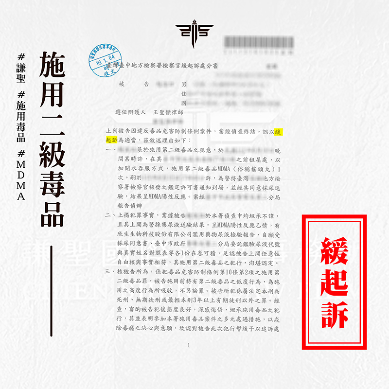 最終,謙聖成功幫當事人拿到施用二級毒品「緩起訴」!只需配合醫院療程,進行戒癮治療,不必失去人身自由的好結果!