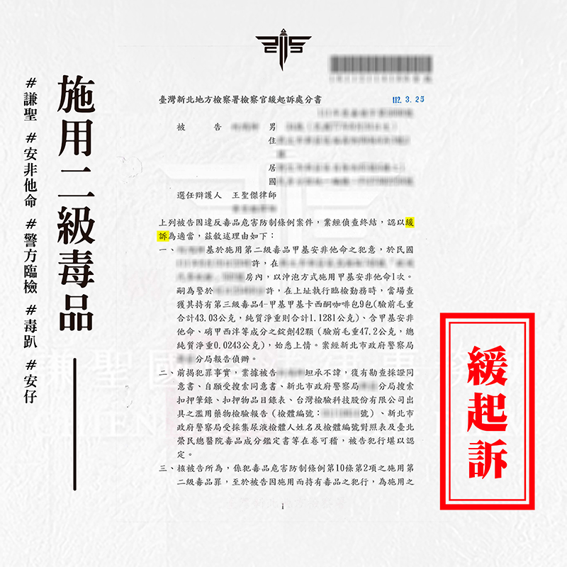 最終,謙聖也不負眾望!漂亮的幫當事人拿下施用安非他命-「緩起訴」附命戒癮治療的好結果!