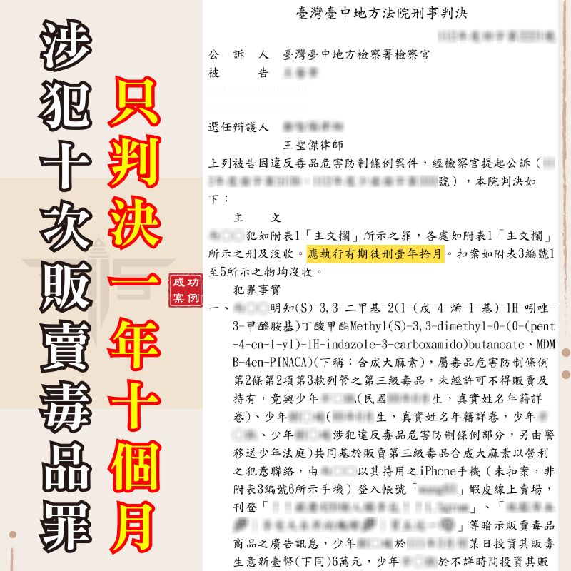 ★數罪併罰的整合策略:透過辯護意見,讓法院在量刑時綜合考量各販賣行為的性質與時間,最終將總刑度壓縮至 1 年 10 個月。