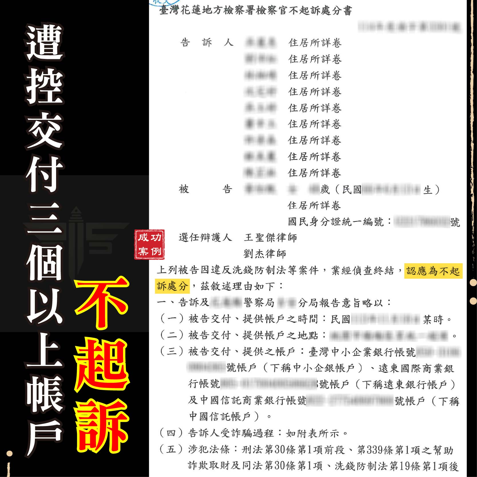 【成功案例】交出三個以上帳戶就一定有罪?律師解析洗錢防制法不起訴關鍵!
