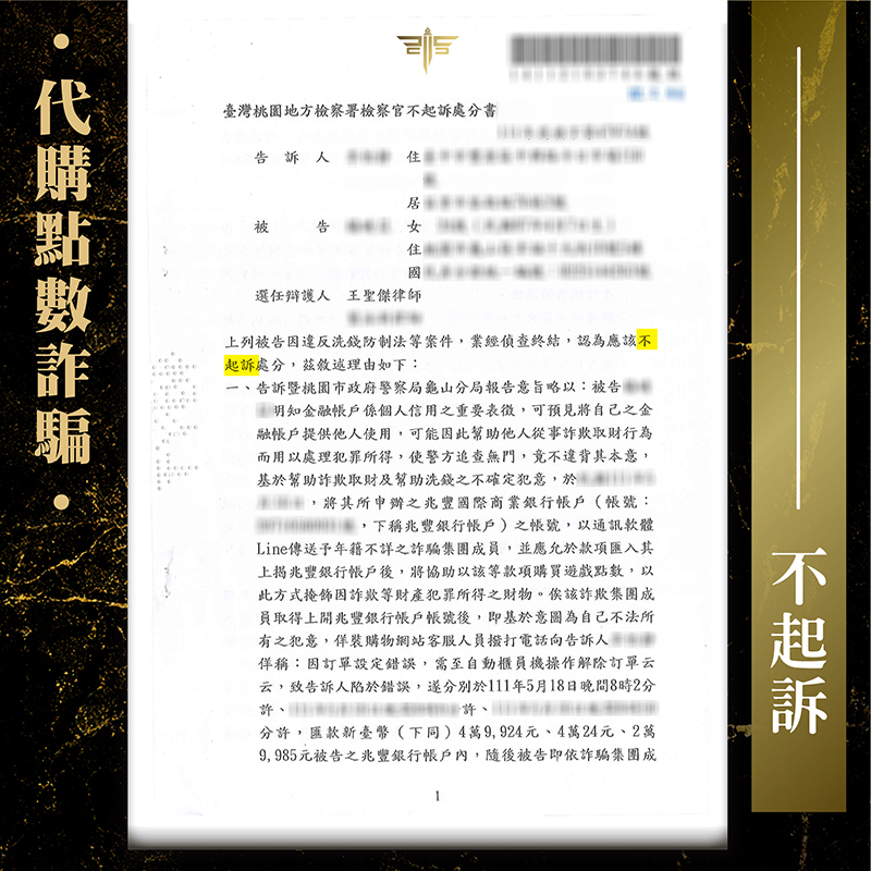 現今網路資訊發達,不少人會使用近期崛起的『小紅書』來追蹤熱門話題!本案當事人正是『小紅書』愛用者之一,偶然在『小紅書』上幫他人代購遊戲點數卡(GASH)來賺取代購費用,沒想到不僅錢沒賺到、還被列為警示帳戶,好在偵查階段就找到謙聖協助處理,成功拿下「不起訴」處分,擺脫莫須有的罪名!