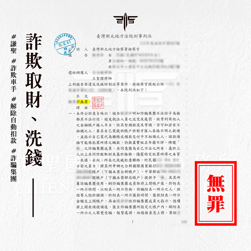 最終,在謙聖嫻熟、專業的辯護下,成功幫助當事人洗清罪嫌,在典型的「解除自動扣款」詐騙案中,拿到詐欺提款車手「無罪」的好結果!