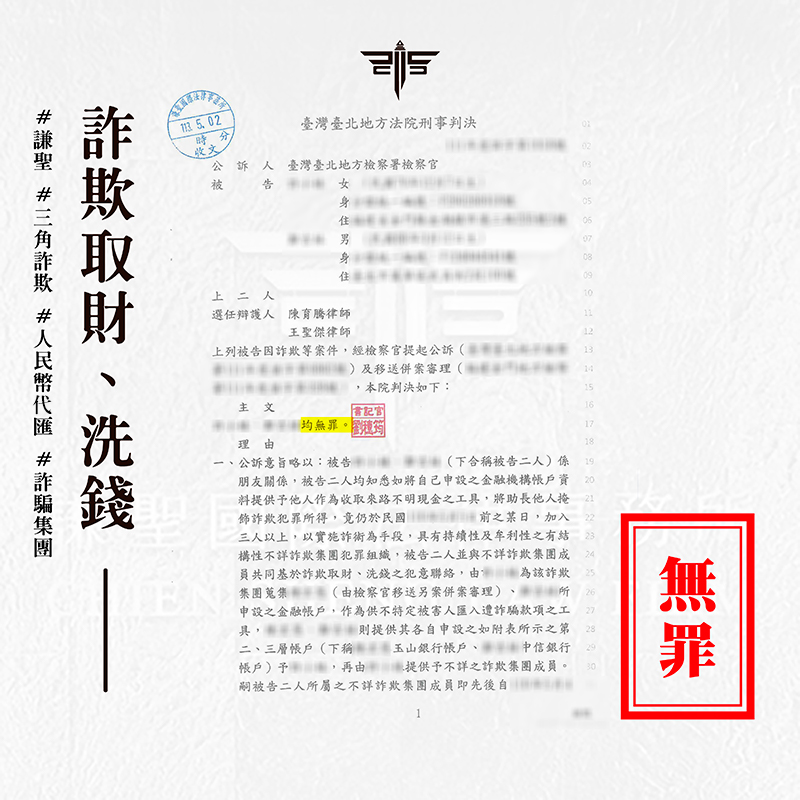 最終,在謙聖律師團隊專業處理下,成功替當事人洗刷冤屈!涉嫌三角詐欺「詐欺取財、洗錢」獲「無罪」判決,免除牢獄之災!