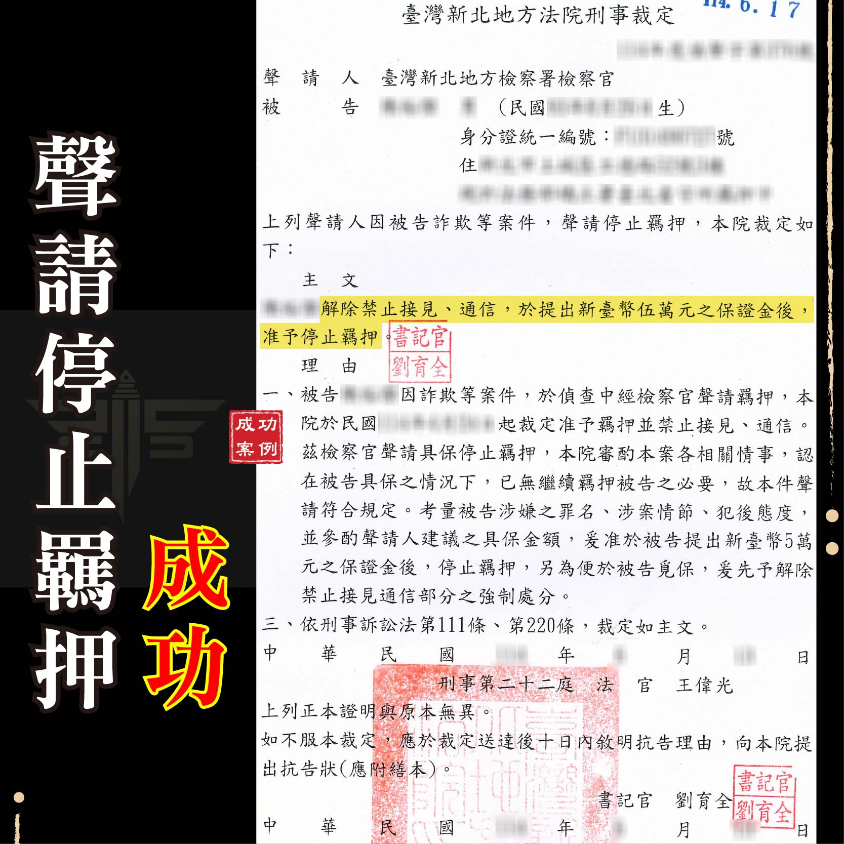 最終,在謙聖專業且有力的辯護下,成功為當事人爭取到「停止羈押、准予交保」的結果,不僅讓當事人免於持續被限制人身自由,也能回歸正常生活、安心準備後續訴訟程序。