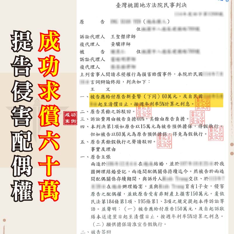 儘管侵害行為主要發生於越南,謙聖國際法律事務所團隊仍堅持主張:婚姻關係在台灣具有效力,配偶權受我國法律保護,因此受害方有權在台灣法院提起侵害配偶權損害賠償之訴。最終,法院採納本所律師的主張,判決被告應賠償原告新台幣60萬元精神慰撫金。