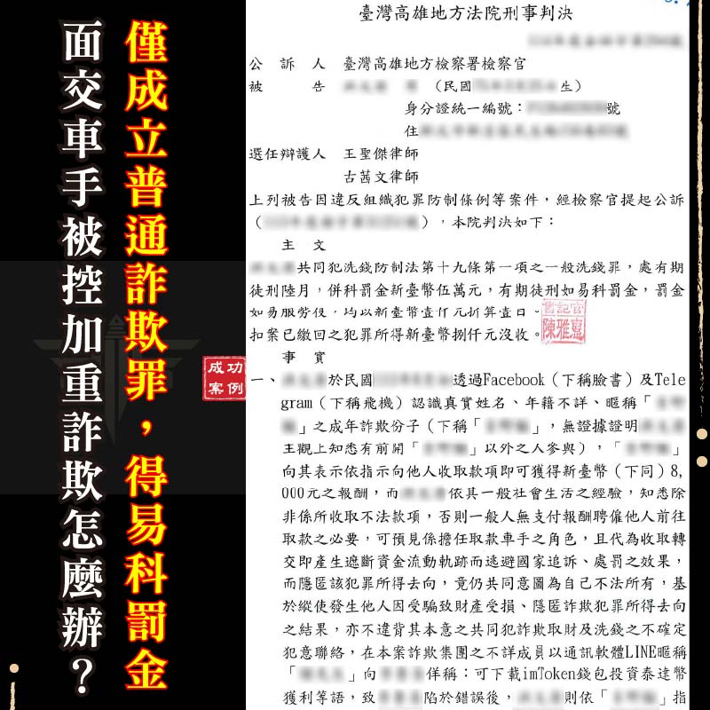 高雄專辦車手案件律師推薦!!面交車手被控加重詐欺怎麼辦?法院判決:僅成立普通詐欺罪,得易科罰金