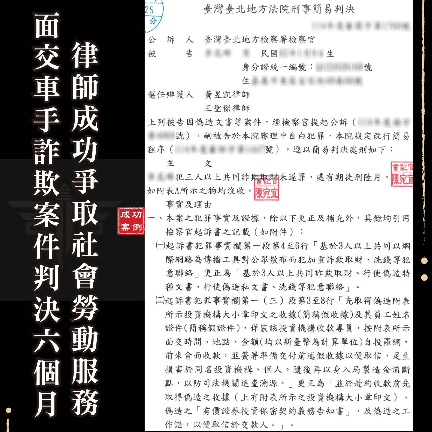 被騙去跟被害人收錢怎麼辦?面交車手詐欺案件判決六個月 — 律師成功爭取社會勞動服務