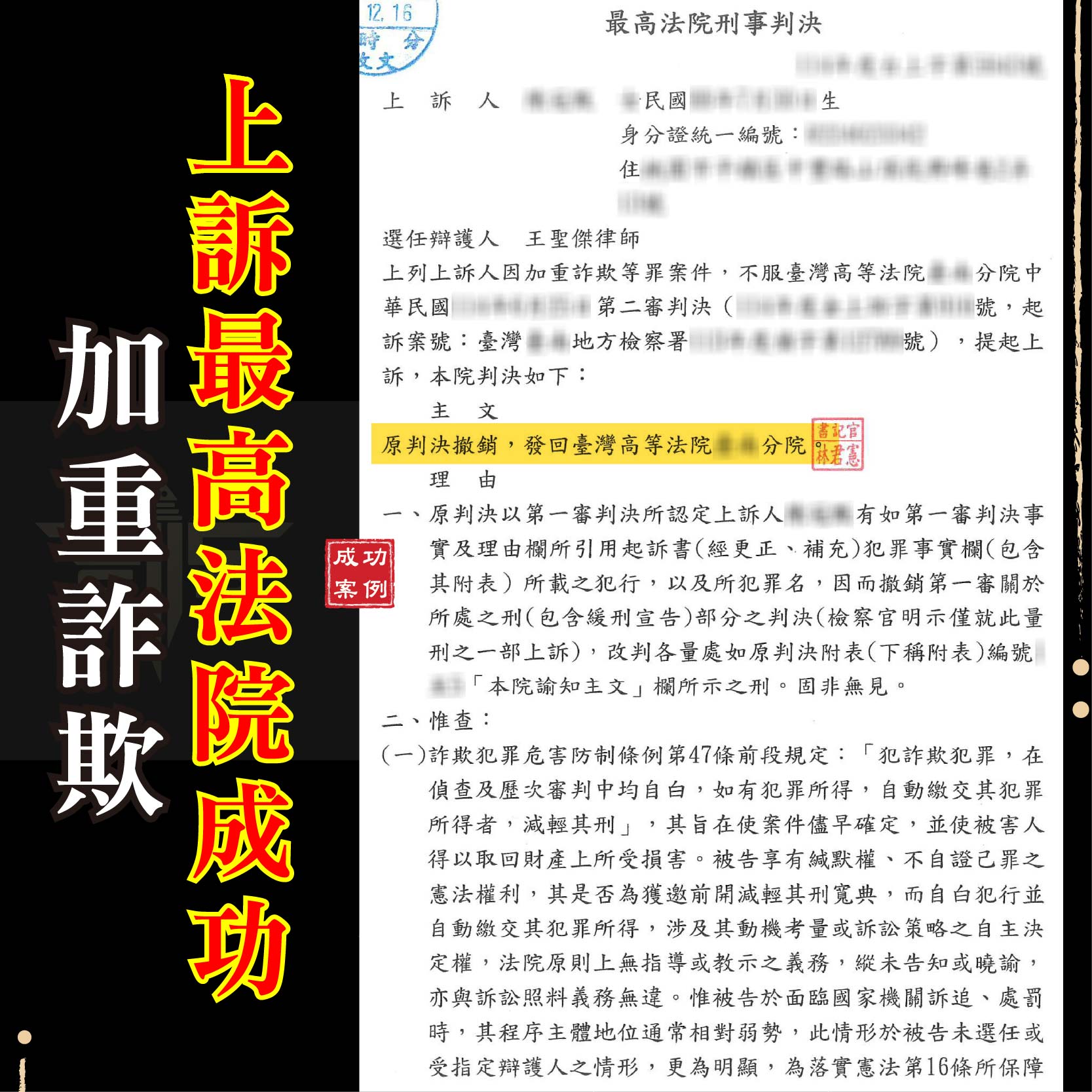加重詐欺案件上訴最高法院成功!!最高法院案件律師推薦!加重詐欺律師推薦