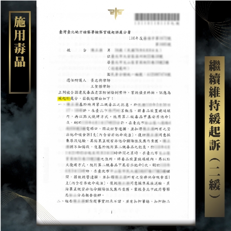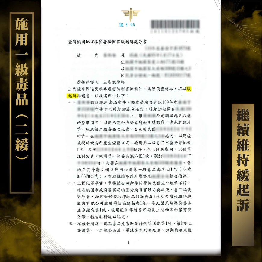 2021/08/17案件說明: 施用一級毒品繼續維持緩起訴(二緩) 本案是發生自「桃園」的毒品案 當事人原先已在醫院接受「戒癮治療」