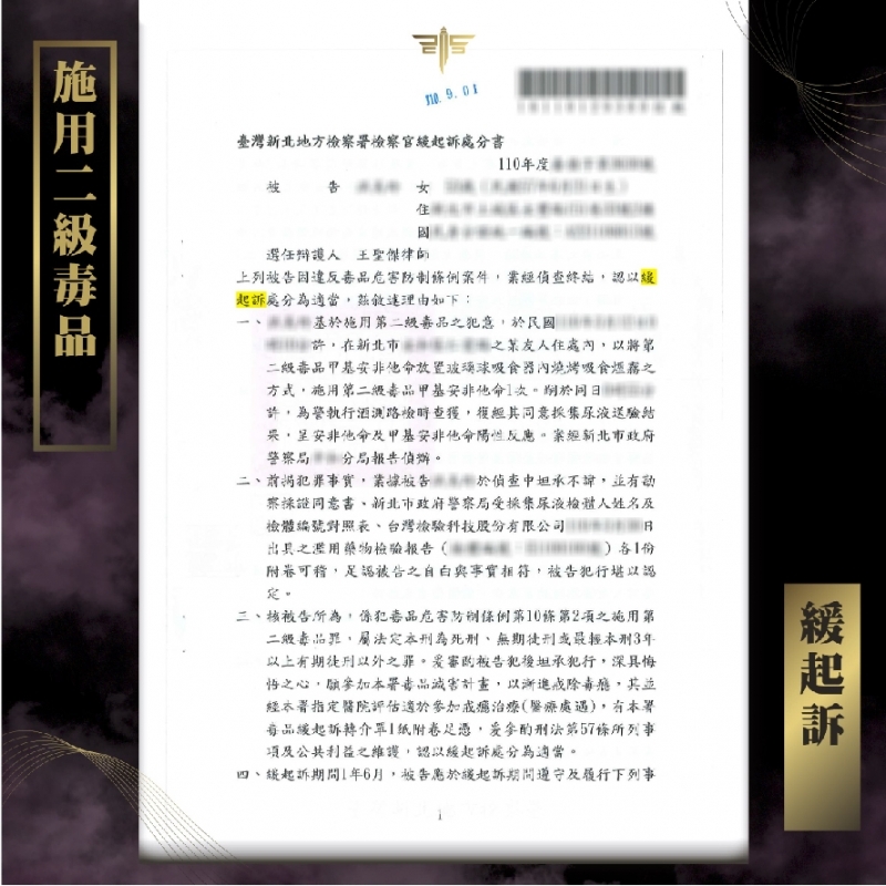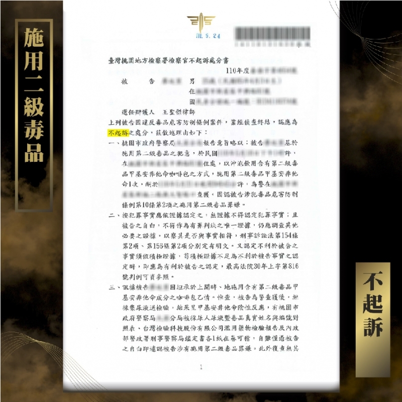 2021/09/28案情過程: 本案當事人因毒品犯罪而被逮捕 並在製作筆錄時坦承自身有吸食二級毒品甲基安非他 事後找上專打毒品案件的謙聖協助處理