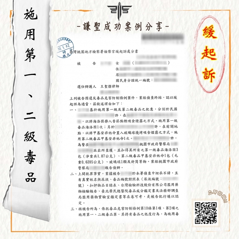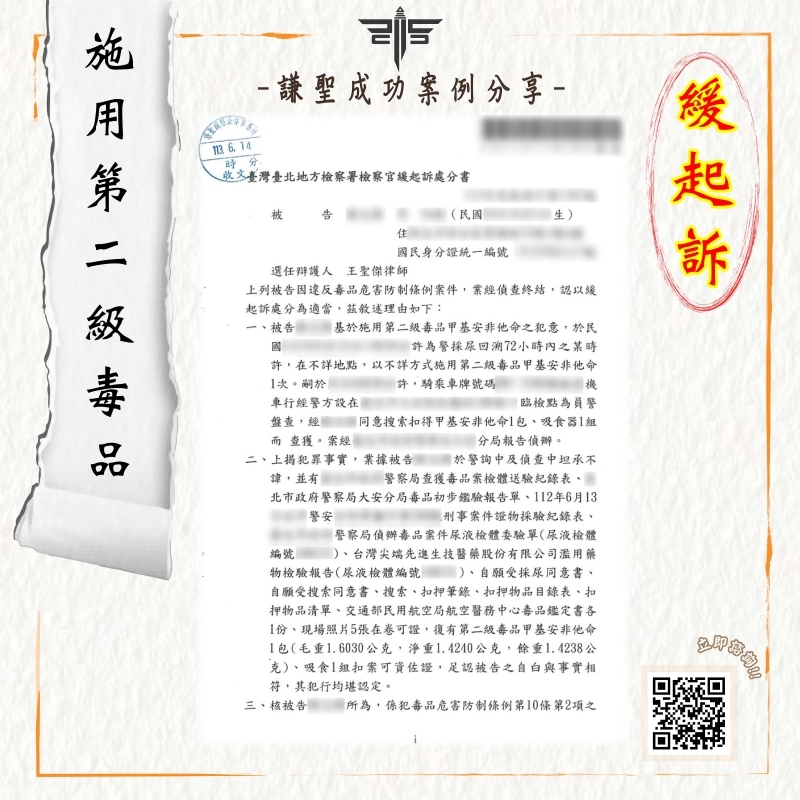 2024/06/14案件說明: 本案將介紹一則關於當事人在臨檢盤查時,被以“施用二級毒品”的罪嫌偵辦。所幸及時找到專精毒品案件的謙聖,成功為當事人獲取「緩起訴」的成功案例。