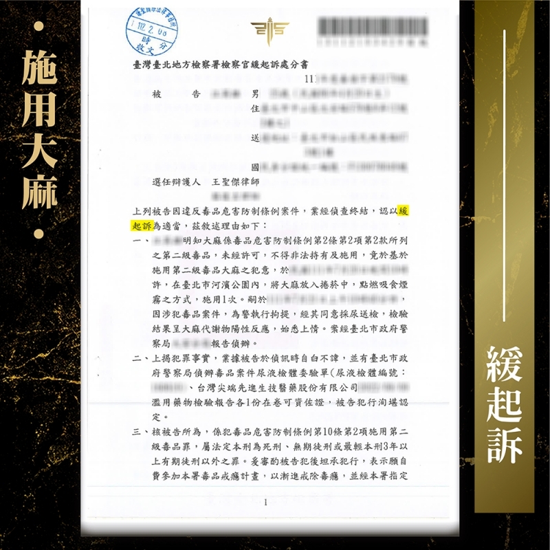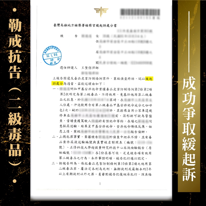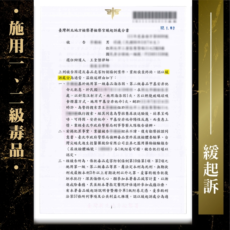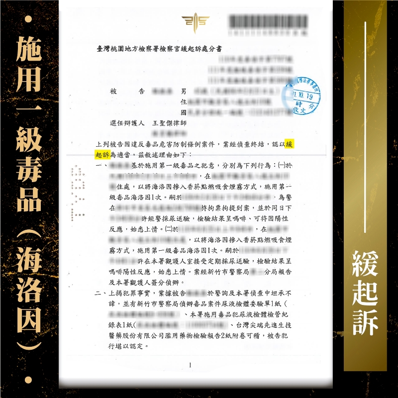 2023/02/08案情過程: 曾遭判刑又有勒戒前科,再次施用「海洛因」、「安非他命」被逮?! 謙聖緊急出手救援,成功擋下勒戒危機,替當事人爭取「緩起訴附命戒