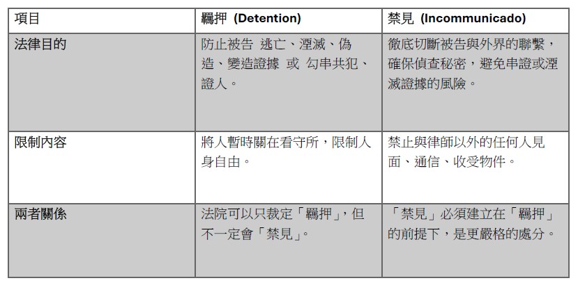在採取行動前,我們首先需要冷靜地理解「羈押」與「禁見」這兩個法律名詞的真正意義。許多人會將兩者混為一談,但它們其實是兩種不同的強制處分,只是經常一併出現。1. 什麼是羈押?什麼是禁見?