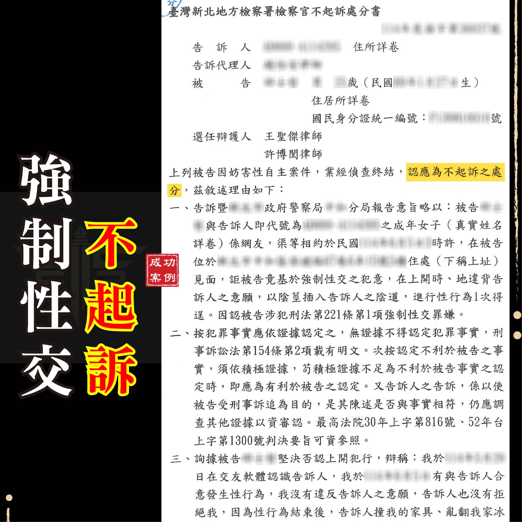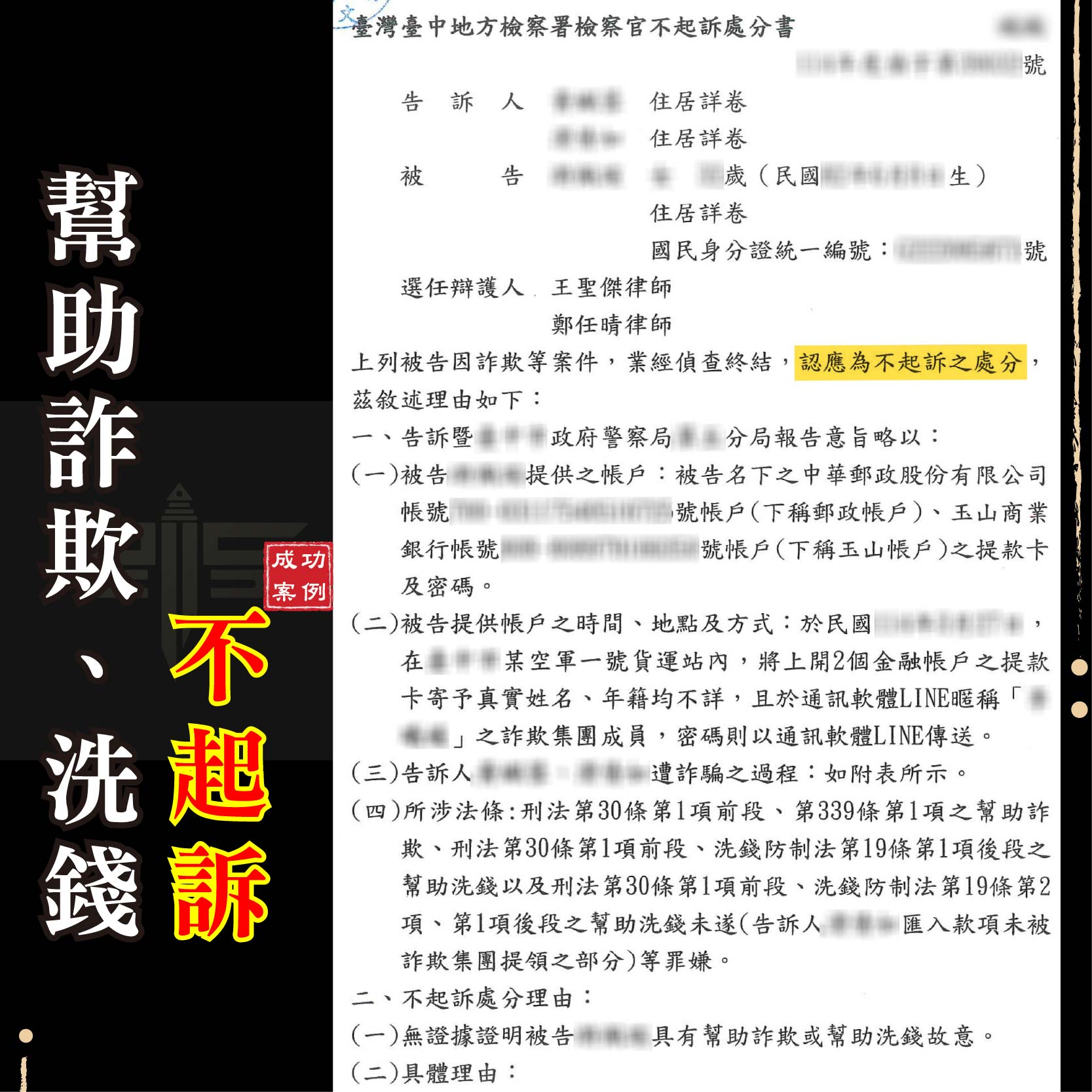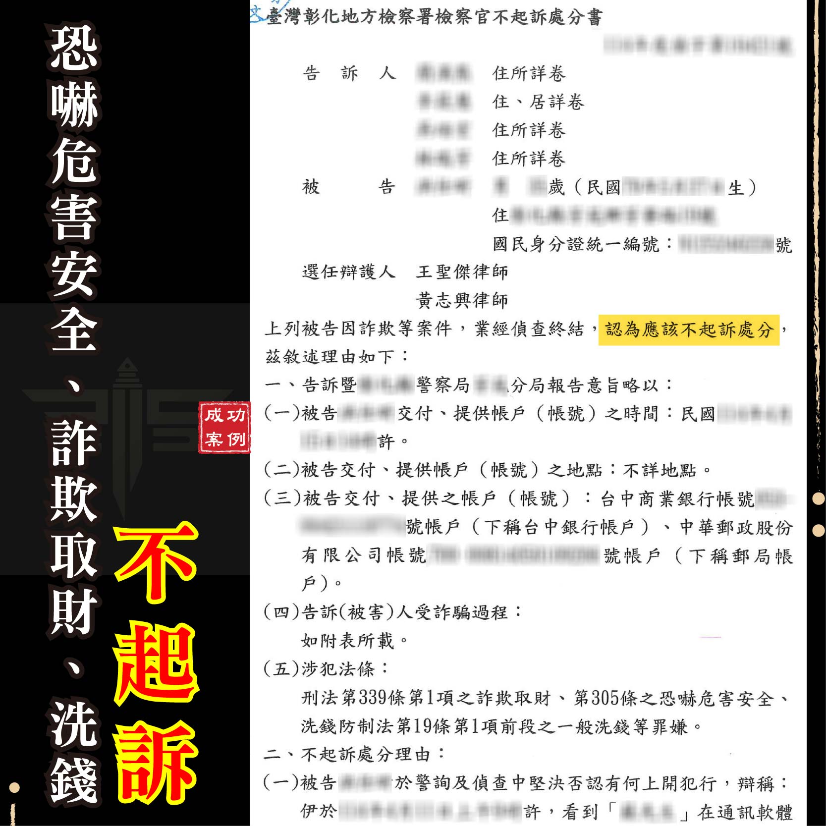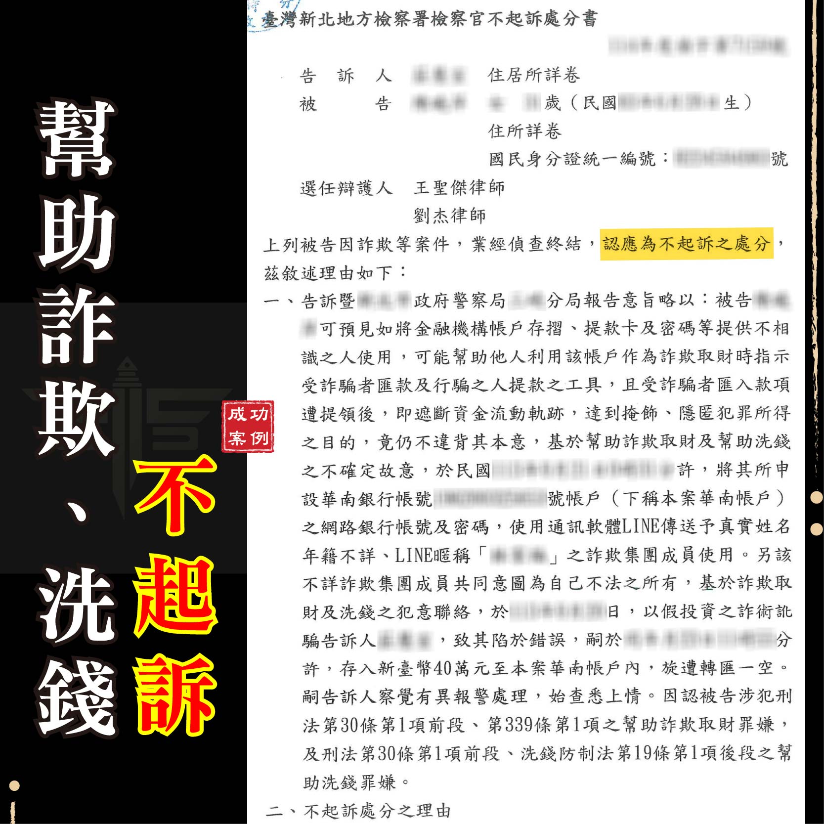 商品資訊刑事案件不起訴成功案例:遭控詐欺取財及恐嚇(彰化地檢 1141013) 遭他人指控強制性交(士林地檢 1141013) 委託友人退稅涉詐欺(新竹地檢 1141014) 遭他人控妨害性自主(新北地檢 1141015) 網路貸款成警示帳戶(新北地檢 1141015) 遭他人指控涉竊盜罪(臺北地檢 1141015) 團購主遭控詐欺車手(新北地檢 1141015) 網路抽獎成警示帳戶(臺中地檢 1141016)         刑事案件緩起訴成功案例:遭控施用第二級毒品(臺中地檢 1141016)  請求分割遺產勝訴成功案例:拿回百萬鉅款遺產(新北地院 1141017)  如有任何法律問題 請立即聯繫→線上免費諮詢平台 ———————————————————謙聖國際法律事務所LINE線上法律諮詢:@lawuicc001(點擊諮詢)歡迎電話預約會議:03-3150-034提供多元支付:現金、信用卡、銀行轉帳【了解更多】Facebook:謙聖國際法律事務所Instagram:chien.sheng_ ———————————————————謙聖國際法律事務所LINE線上法律諮詢:@lawuicc001(點擊諮詢)歡迎電話預約會議:03-3150-034提供多元支付:現金、信用卡、銀行轉帳【了解更多】Facebook:謙聖國際法律事務所Instagram:chien.sheng_