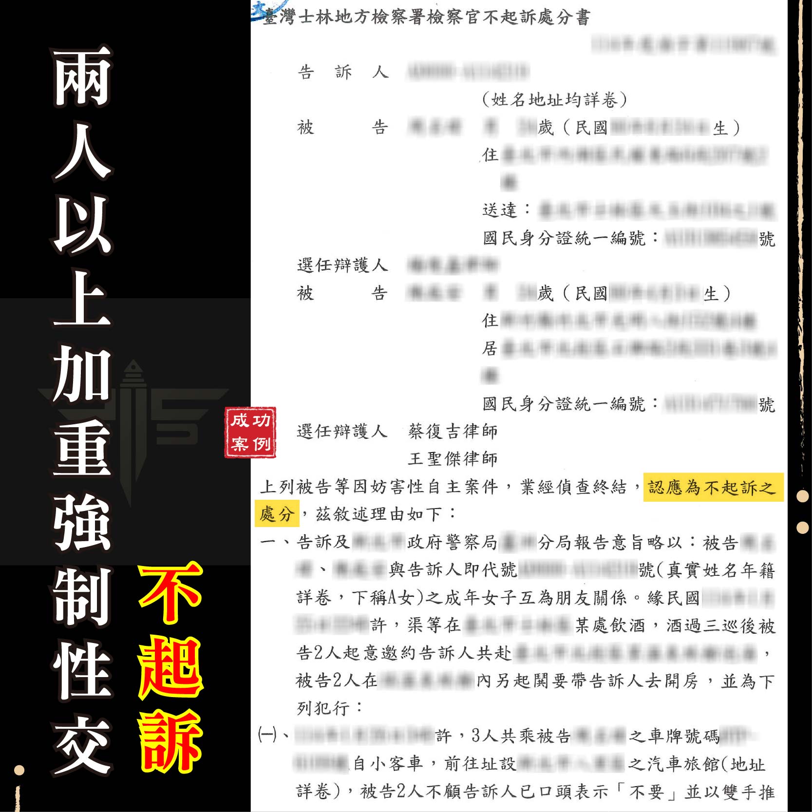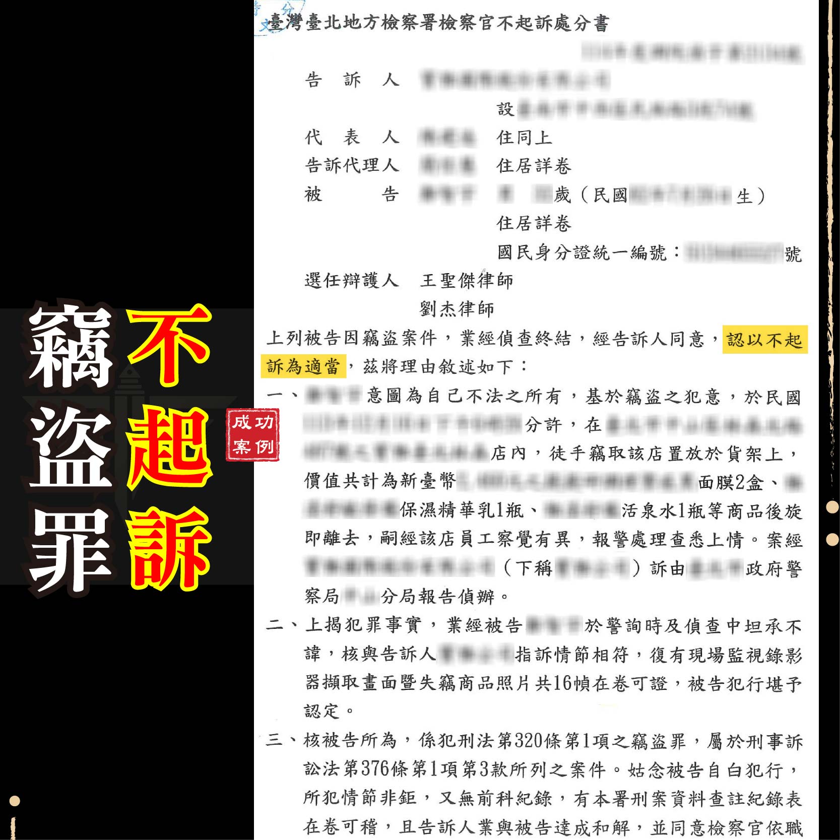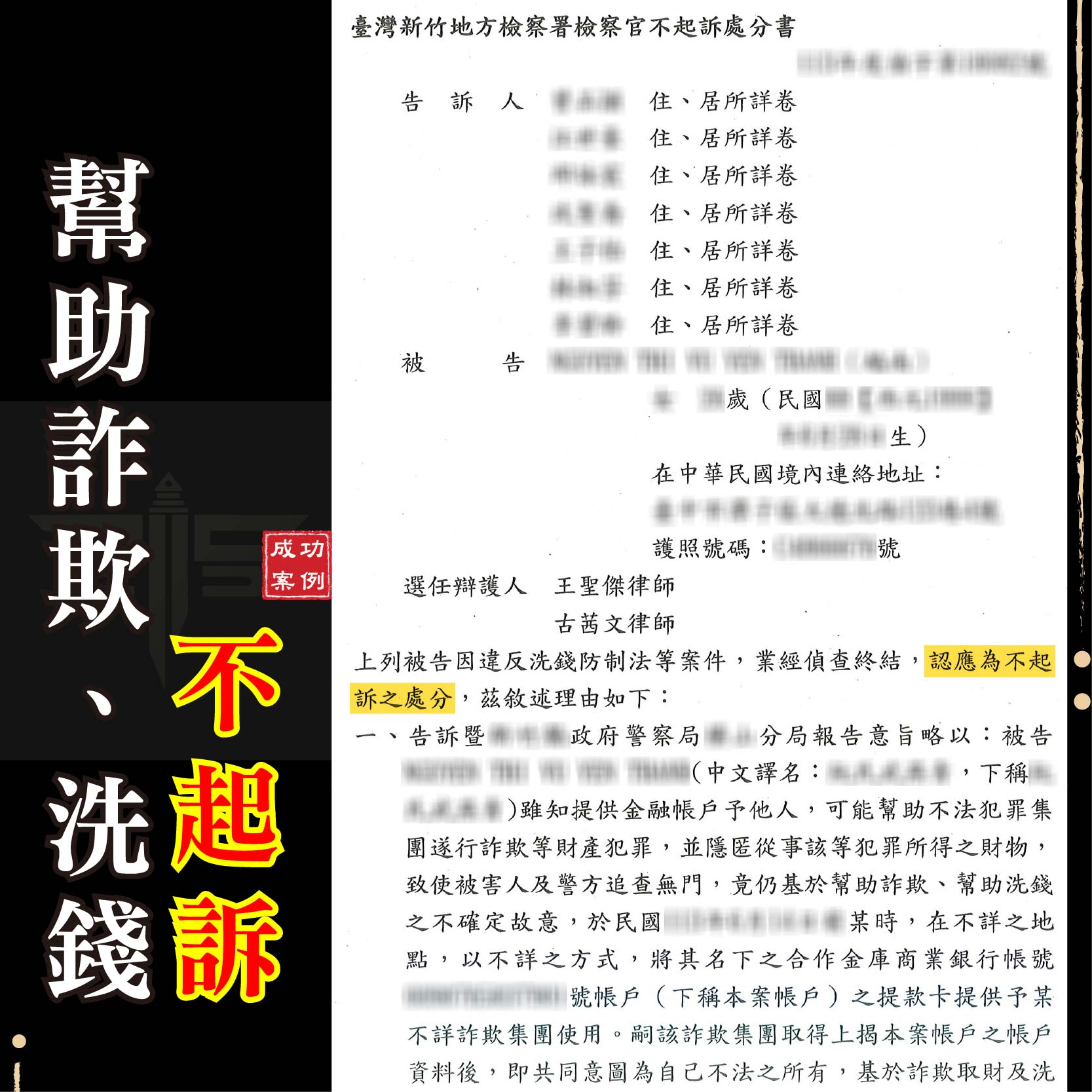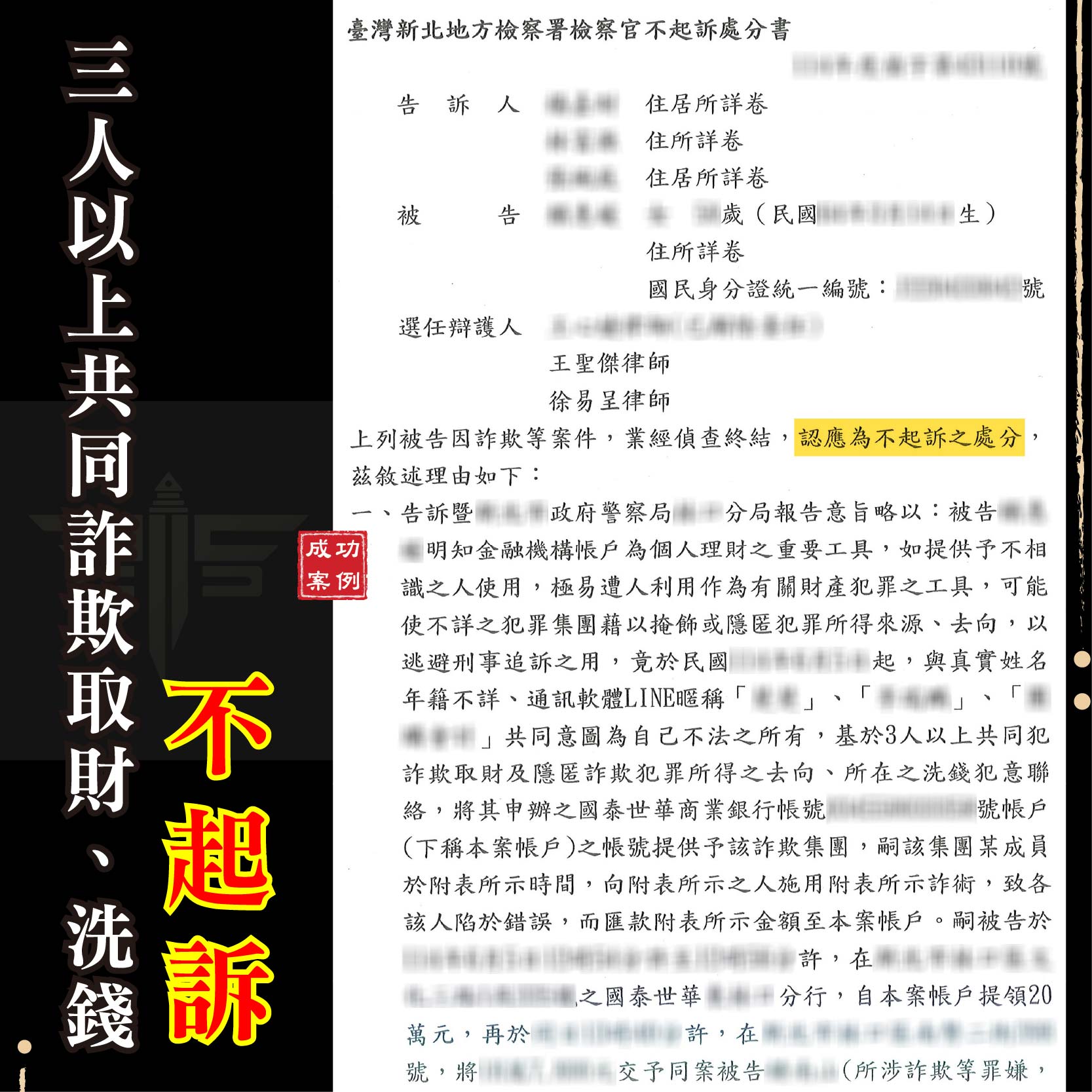 商品資訊刑事案件不起訴成功案例:遭控詐欺取財及恐嚇(彰化地檢 1141013) 遭他人指控強制性交(士林地檢 1141013) 委託友人退稅涉詐欺(新竹地檢 1141014) 遭他人控妨害性自主(新北地檢 1141015) 網路貸款成警示帳戶(新北地檢 1141015) 遭他人指控涉竊盜罪(臺北地檢 1141015) 團購主遭控詐欺車手(新北地檢 1141015) 網路抽獎成警示帳戶(臺中地檢 1141016)         刑事案件緩起訴成功案例:遭控施用第二級毒品(臺中地檢 1141016)  請求分割遺產勝訴成功案例:拿回百萬鉅款遺產(新北地院 1141017)  如有任何法律問題 請立即聯繫→線上免費諮詢平台 ———————————————————謙聖國際法律事務所LINE線上法律諮詢:@lawuicc001(點擊諮詢)歡迎電話預約會議:03-3150-034提供多元支付:現金、信用卡、銀行轉帳【了解更多】Facebook:謙聖國際法律事務所Instagram:chien.sheng_ ———————————————————謙聖國際法律事務所LINE線上法律諮詢:@lawuicc001(點擊諮詢)歡迎電話預約會議:03-3150-034提供多元支付:現金、信用卡、銀行轉帳【了解更多】Facebook:謙聖國際法律事務所Instagram:chien.sheng_