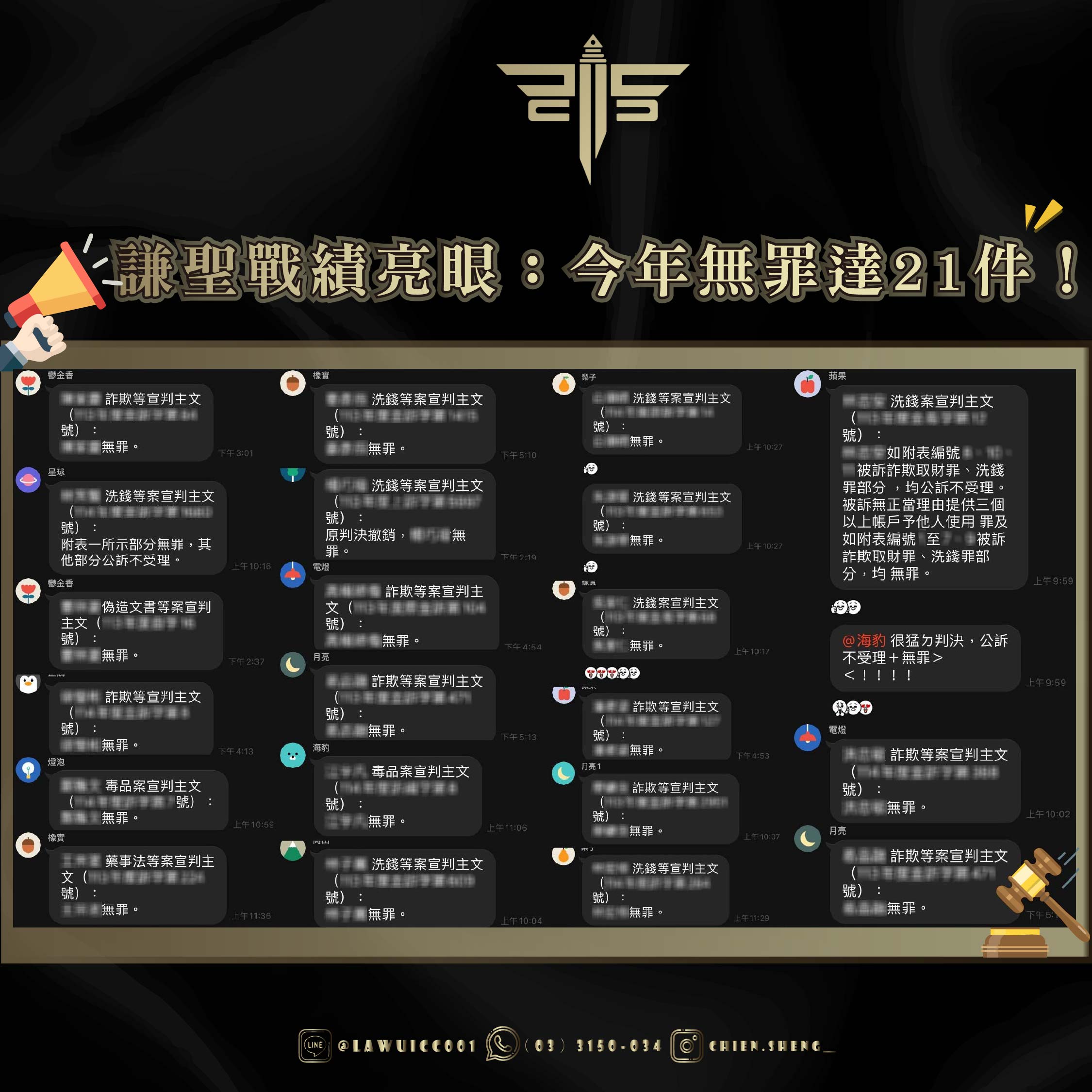 謙聖相信每一位被指控的人都值得被傾聽與辯護,21件無罪,只是今年的里程碑,更是團隊堅持專業與守護當事人清白的真實展現。如有任何法律問題