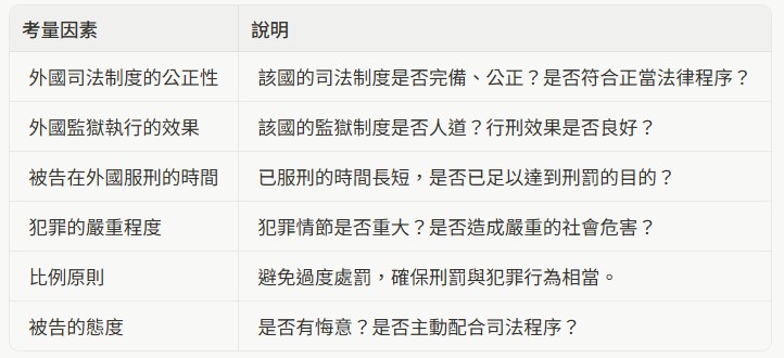 許多人會質疑:「這不是違反一事不再理原則嗎?」答案是:不違反。一事不再理原則是指,同一個犯罪行為不能被同一個國家的司法機關重複審判。這項原則主要適用於同一國家內部,目的是保障被告不會因為同一件事被重複追訴。然而,當涉及跨國案件時,由於各國司法主權獨立,一事不再理原則原則上不適用於不同國家之間。最高法院在判決中特別強調,刑法第九條對於外國裁判之效力,只是排斥在外國已執行之刑於本國重複執行,不涉及裁判上之國際性一事不再理或重複處罰問題。簡單來說,台灣法院可以再次審判,但會考慮您在國外已經受到的處罰,避免讓您重複服刑。第二部分:刑法第九條的刑期折抵規定