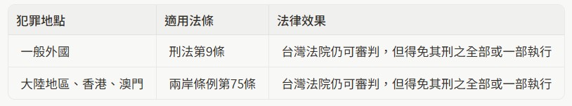 一、在「外國」犯罪:適用刑法第九條如果您是在一般外國犯罪並服刑,返台後適用的是刑法第九條的規定。二、在「大陸地區、香港、澳門」犯罪:適用兩岸條例第七十五條如果您是在大陸地區、香港或澳門犯罪並服刑,返台後適用的是台灣地區與大陸地區人民關係條例第七十五條的規定。該條規定,在大陸地區或香港、澳門犯罪,經大陸地區或香港、澳門法院裁判確定者,仍得依本條例處斷。但在大陸地區或香港、澳門已受刑之全部或一部執行者,得免其刑之全部或一部之執行。這條規定的法律效果與刑法第九條類似,都是得免除刑罰的全部或一部執行,法官同樣有裁量權。三、法律適用比較表