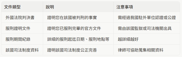 為了向法院證明您確實在國外已經服刑,並爭取刑期折抵,您需要準備以下文件: