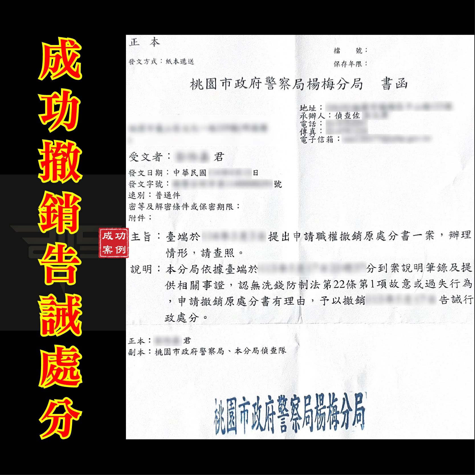➙最終,警察機關審酌理由後,正式同意撤銷原告誡處分,並函文通知當事人撤銷結果,成功恢復清白紀錄。