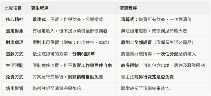 如果說更生是「重建」,那麼清算程序就是「清算」。清算程序是將您名下所有財產(扣除生活必需品後)全部變現,由法院統一分配給所有債權人。清算完畢後,法院會視情況裁定是否免責。兩者最大的差異在於對財產的處理方式與生活的影響程度。