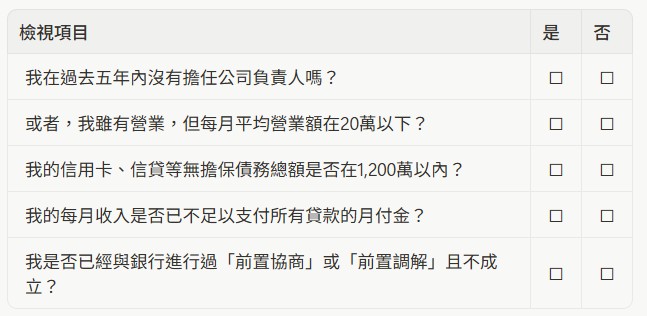 消債條例的適用對象是「消費者」,其定義為:1.五年內未從事營業活動:指您在申請前的五年內,沒有擔任公司、行號的負責人或股東。2.或從事小規模營業活動:即使有營業行為,但平均每月營業額在新台幣20萬元以下的自營業者(例如:計程車司機、小吃攤販、網拍賣家等),仍符合資格。條件二:債務總額與清償能力