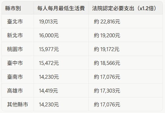 「必要生活支出」並非您自己說了算,法院會參考各地區的最低生活費標準(通常是1.2倍)來認定。例如,以台北市112年度最低生活費19,013元計算,您的個人必要支出約為22,816元。若您還需扶養親屬,可再依比例增加。