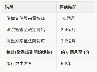 步驟七:法院認可更生方案方案經債權人會議可決,或雖未獲可決但法院認為內容已具備誠意與公平性,便會裁定認可。這份經認可的更生方案,就是您未來6至8年的還款聖經。步驟八:忠實履行方案您必須嚴格依照方案內容按時還款。此期間,您的生活將受到一定程度的監督,例如不得有奢侈浪費的行為,且若有重大收入變動(如加薪、中獎、繼承遺產),應主動向法院申報。步驟九:聲請履行完畢,迎向「當然免責」1.履行方案:更生方案經法院認可後,您只需依照方案內容,按時還款6至8年。2.履行完畢:當您完成所有還款義務後,即可向法院聲請「履行完畢證明」。3.當然免責:根據《消費者債務清理條例》第76條,取得證明後,除了法有明定的不免責債權(如罰金、怠金)外,所有在更生程序中已申報及未申報的債務,全部歸於消滅。四、債務更生要花多少錢?費用與時間成本分析