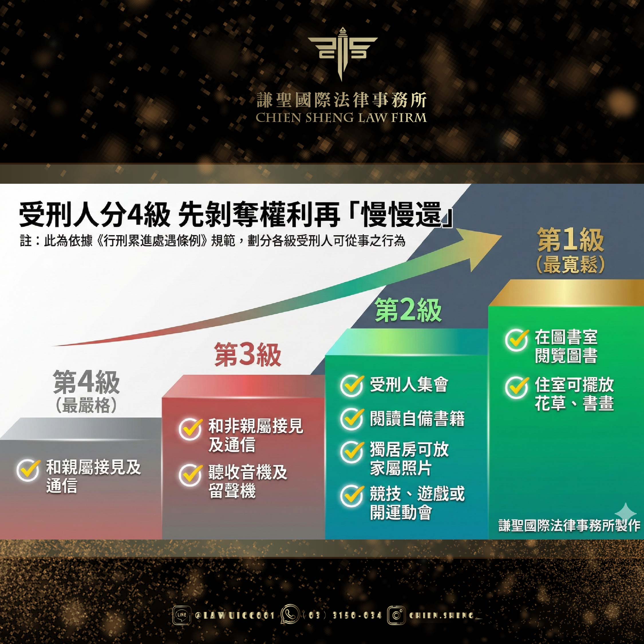 謙聖國際法律事務所長期處理各類刑事案件,我們深知當事人與家屬在判決確定後,面對執行階段的無助與焦慮。因此,我們特別根據《行刑累進處遇條例》及相關法規,為您完整解析這套決定受刑人監獄生活的核心制度,讓您一次搞懂「四級、三級、二級、一級」的差別,以及如何為提早回歸社會做好準備。