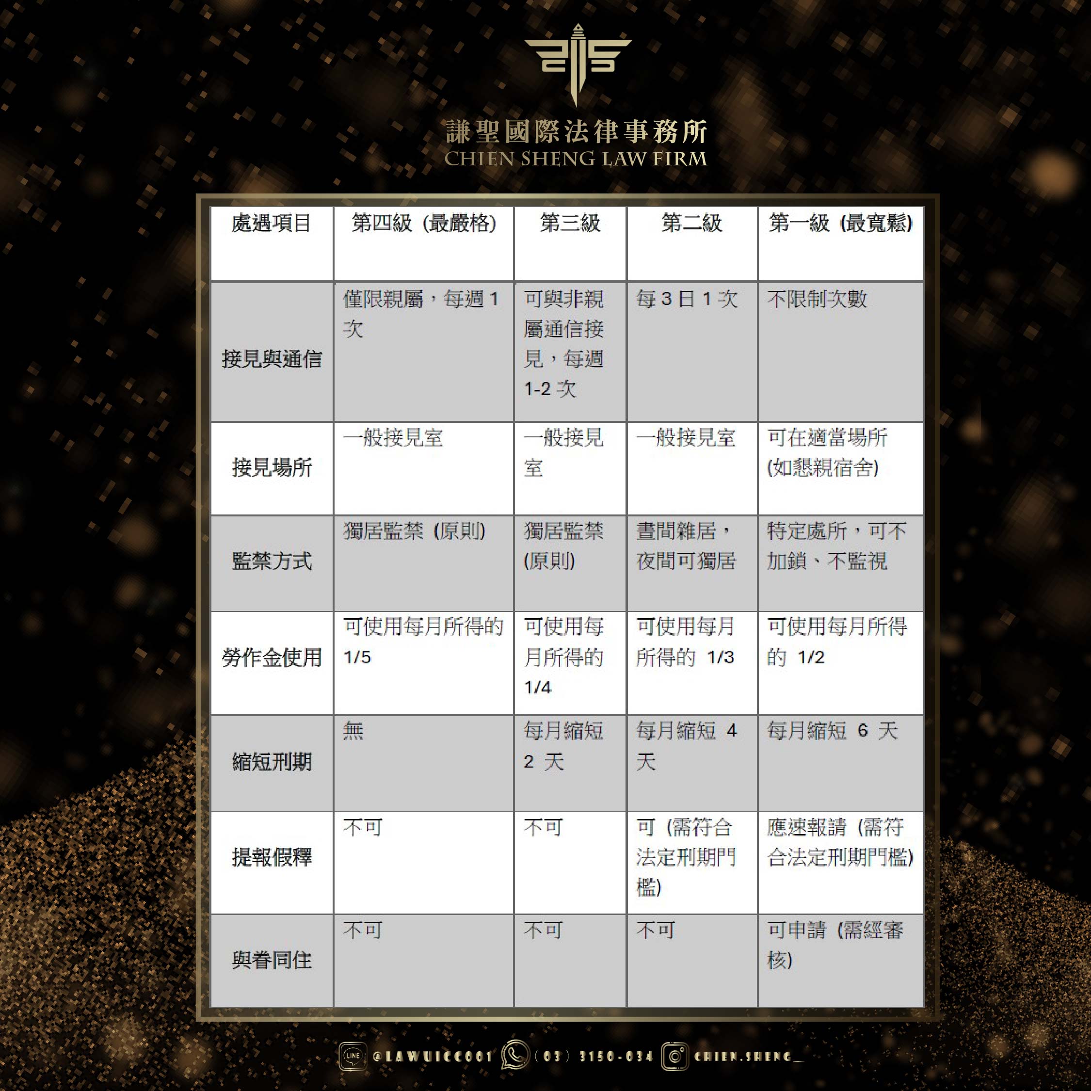 •縮短刑期:從這個級別開始,每月可以縮短刑期 2 天,是邁向自由的重要一步。 (同法第28-1條)