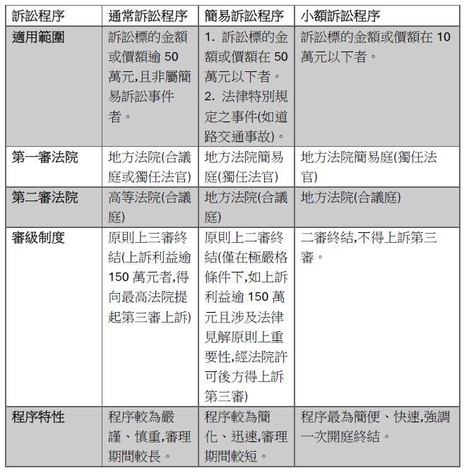 為了理解簡易程序對車禍死亡賠償案件的影響,首先需要認識我國民事訴訟制度中三種主要程序的差異。我國民事訴訟法為求司法資源的有效運用,依據案件性質與標的價額,將財產權訴訟區分為「通常程序」、「簡易程序」及「小額程序」三類。