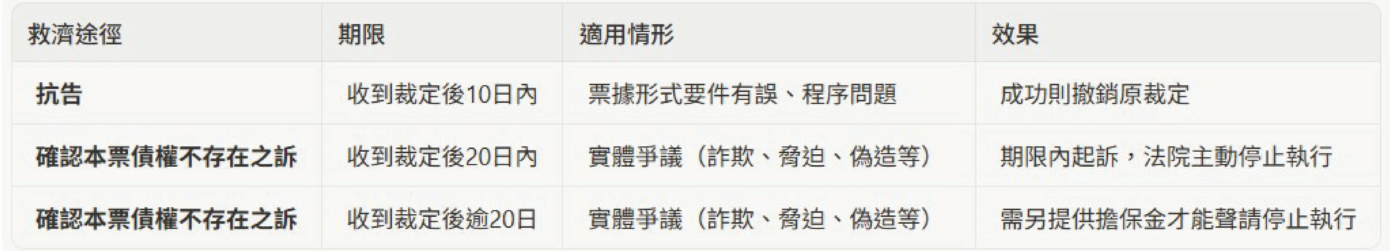 根據《非訟事件法》規定,對於法院的本票裁定,發票人可在收到裁定的 10日 內提起抗告。然而,必須注意的是,抗告的理由僅限於程序上或本票形式上的爭議,例如本票要件不全、簽名非本人等。對於是否被詐欺或脅迫等實體上的爭議,並非抗告程序所能處理。2.二十日內提起「確認本票債權不存在之訴」: