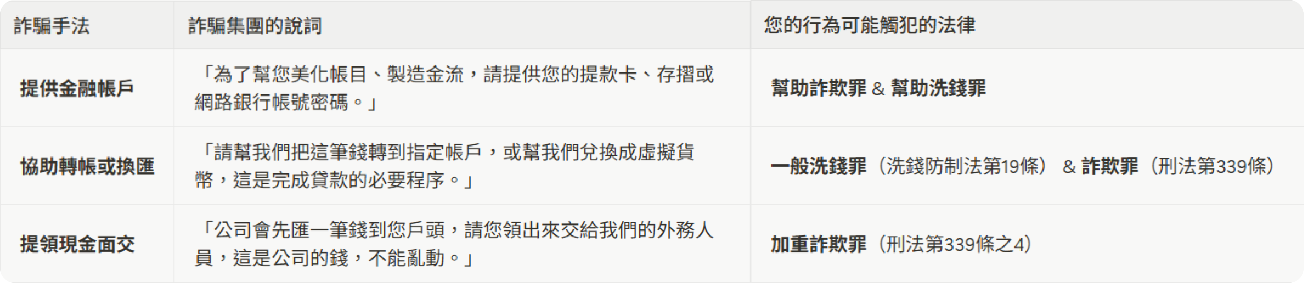 3.切勿輕信脫罪話術:詐騙集團在事發後,有時會回頭聯繫您,教導您如何應對檢警,或承諾會幫您處理。請切記,他們只會為了自身脫罪而犧牲您,切勿再次相信他們的任何說詞。
