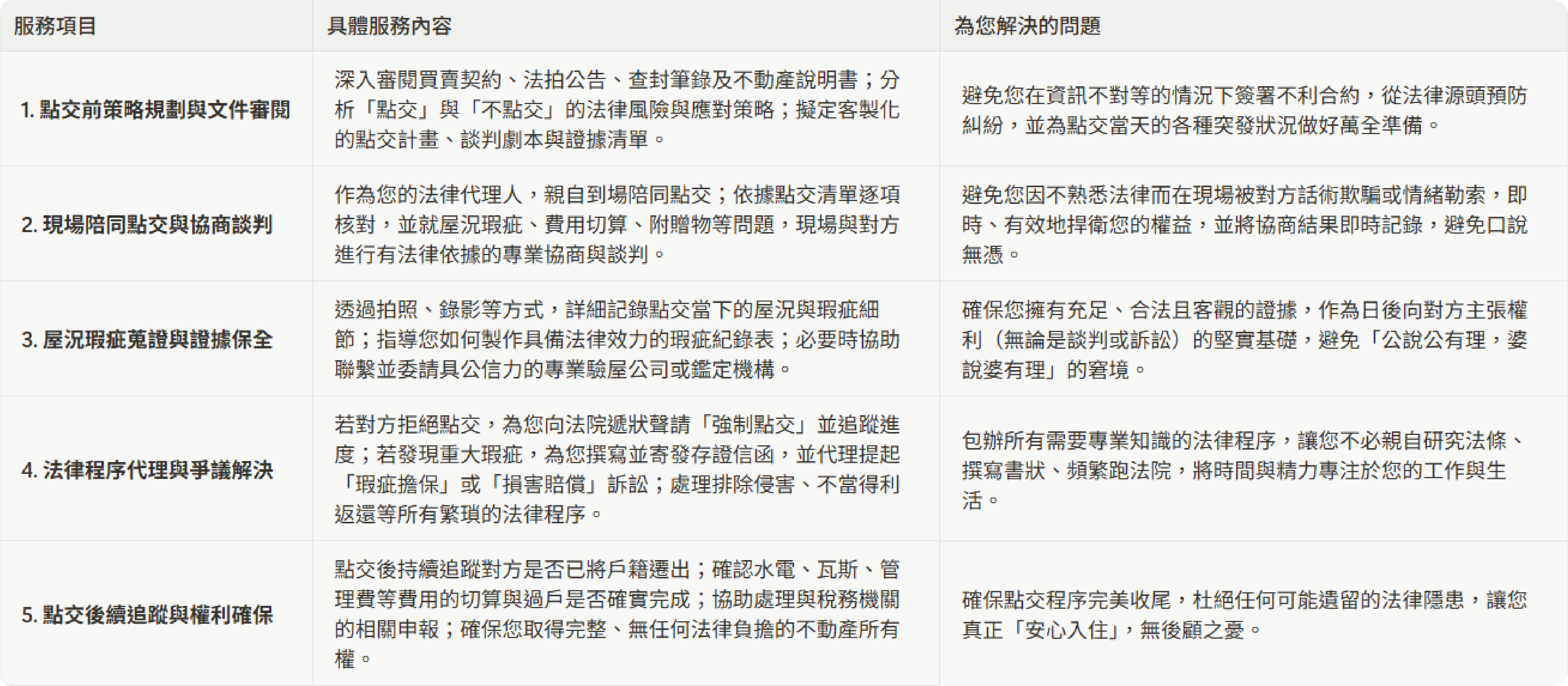 三、不動產點交律師的五大核心服務:不只是陪你拿鑰匙