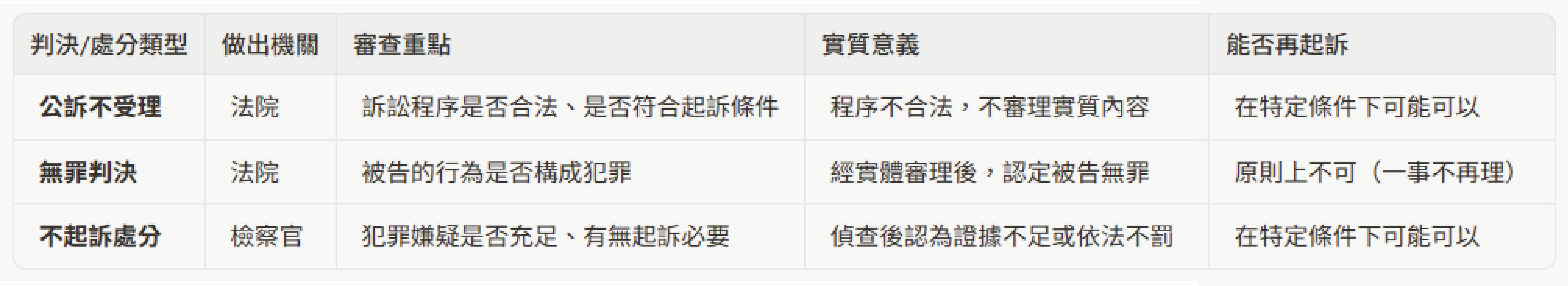 首先,我們必須建立一個最重要的觀念:「公訴不受理」判決,並不等於法院認證您「無罪」。它是一種「程序判決」,而非「實體判決」。•程序判決:法院在不進入案件核心(也就是被告究竟有沒有犯罪)的情況下,僅就訴訟程序上的要件進行審查。如果發現起訴程序不合法或有其他法定障礙,法院就會直接裁定不受理,結束這次的訴訟程序。•實體判決:法院經過開庭、調查證據、言詞辯論等完整審理程序後,針對被告的行為是否構成犯罪,做出有罪或無罪的最終認定。簡單來說,公訴不受理就像是法院在比賽正式開始前,發現某方選手的參賽資格不符,因此直接取消其比賽資格,而不去評論這位選手的實力高低。這也意味著,如果檢察官補正了程序上的瑕疵,未來仍有可能針對同一案件重新起訴。為了讓您更清晰地理解其中差異,謙聖國際法律事務所為您整理了以下比較表: