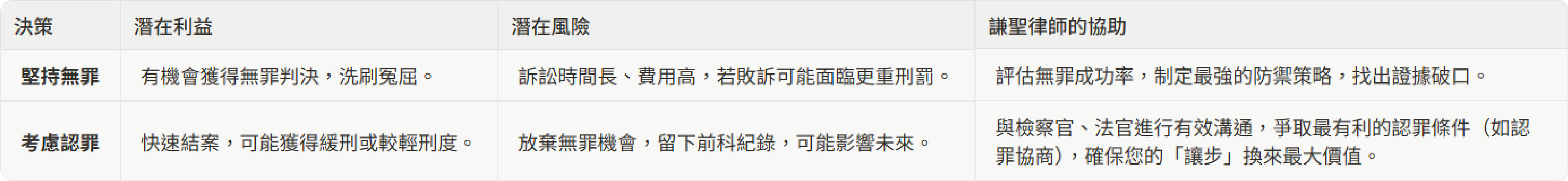 當法官拋出「是否認罪」的問題時,請記住,您最不該做的事,就是「立即回答」。您擁有思考和諮詢的權利。以下是我們建議的應對策略,這也是謙聖國際法律事務所在法庭上必定會為客戶捍衛的權利。