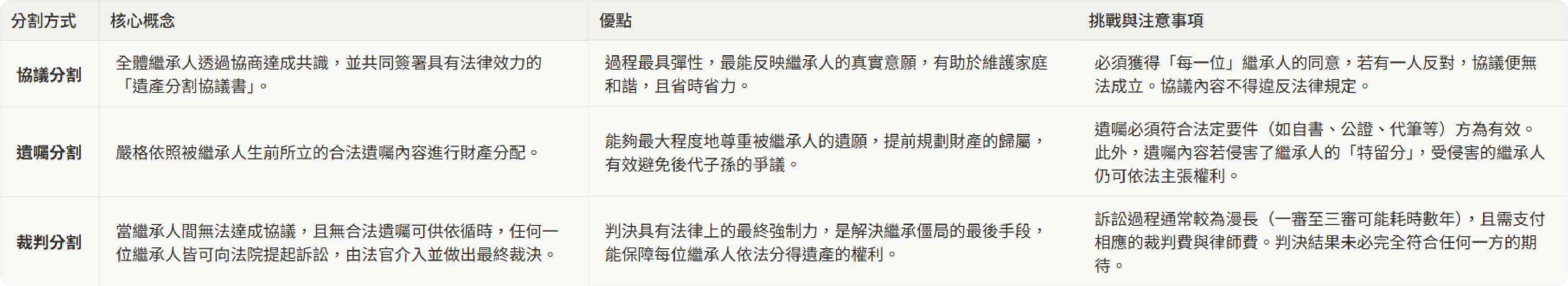 在台灣的法律框架下,完成遺產分割主要有三種方式。了解它們的特性與適用情境,是您與家人開啟有效溝通的第一步。謙聖國際法律事務所為您整理了詳細的比較表格,讓您一目了然。