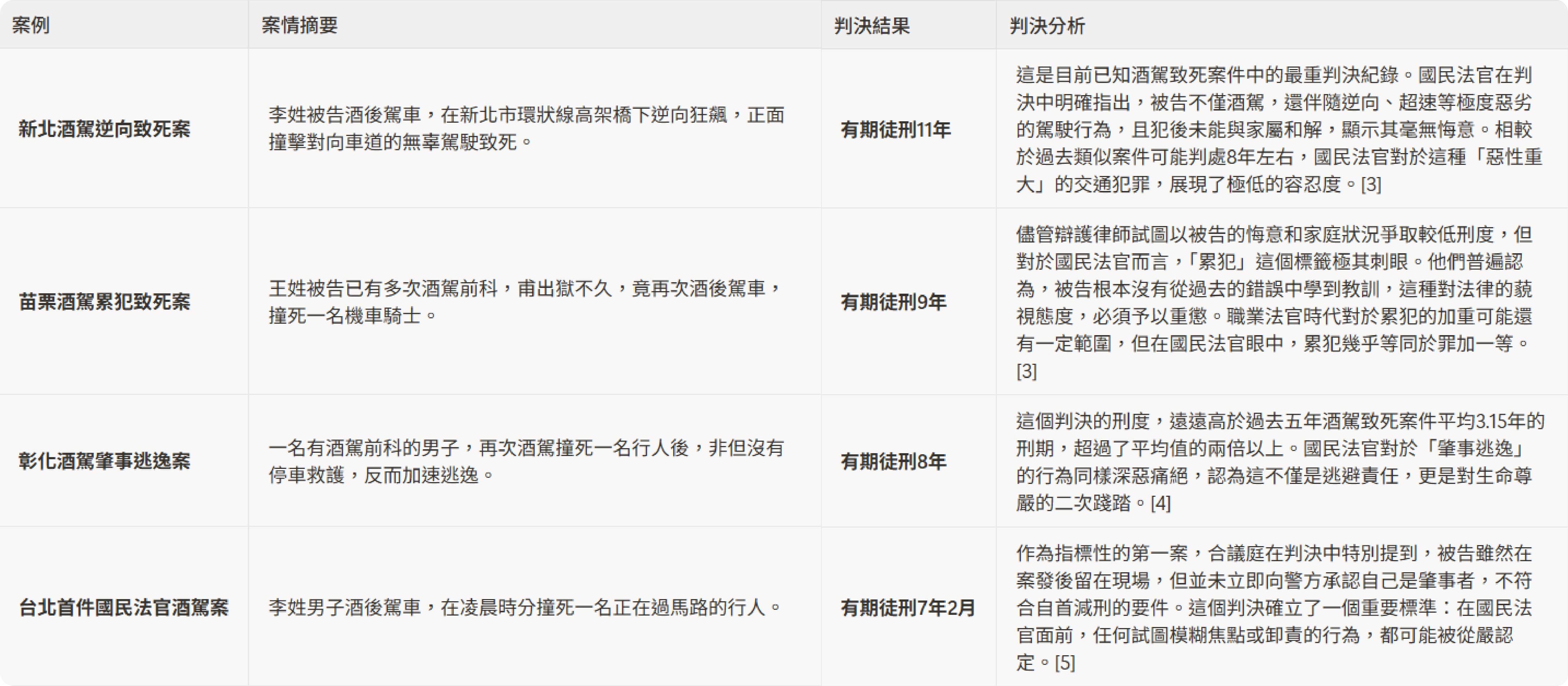 •國民法官時期: 自從國民法官上路後,酒駕致死的判決「起跳價」普遍都在7年以上,甚至出現了多起判處超過10年的重刑案例。傳統的量刑行情參考,在國民法官面前幾乎完全失效。
