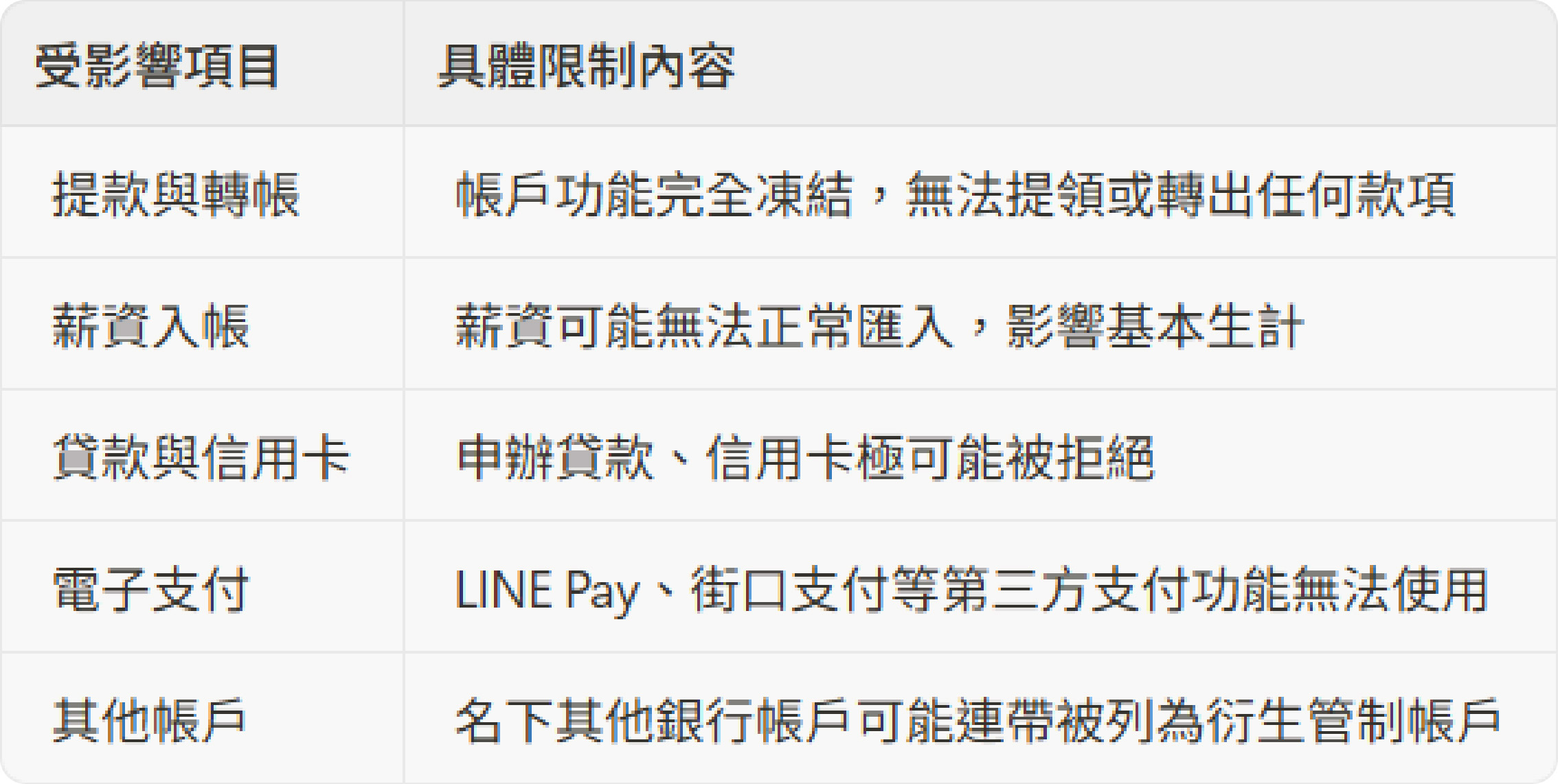 以下是警示帳戶對您日常生活的具體影響: