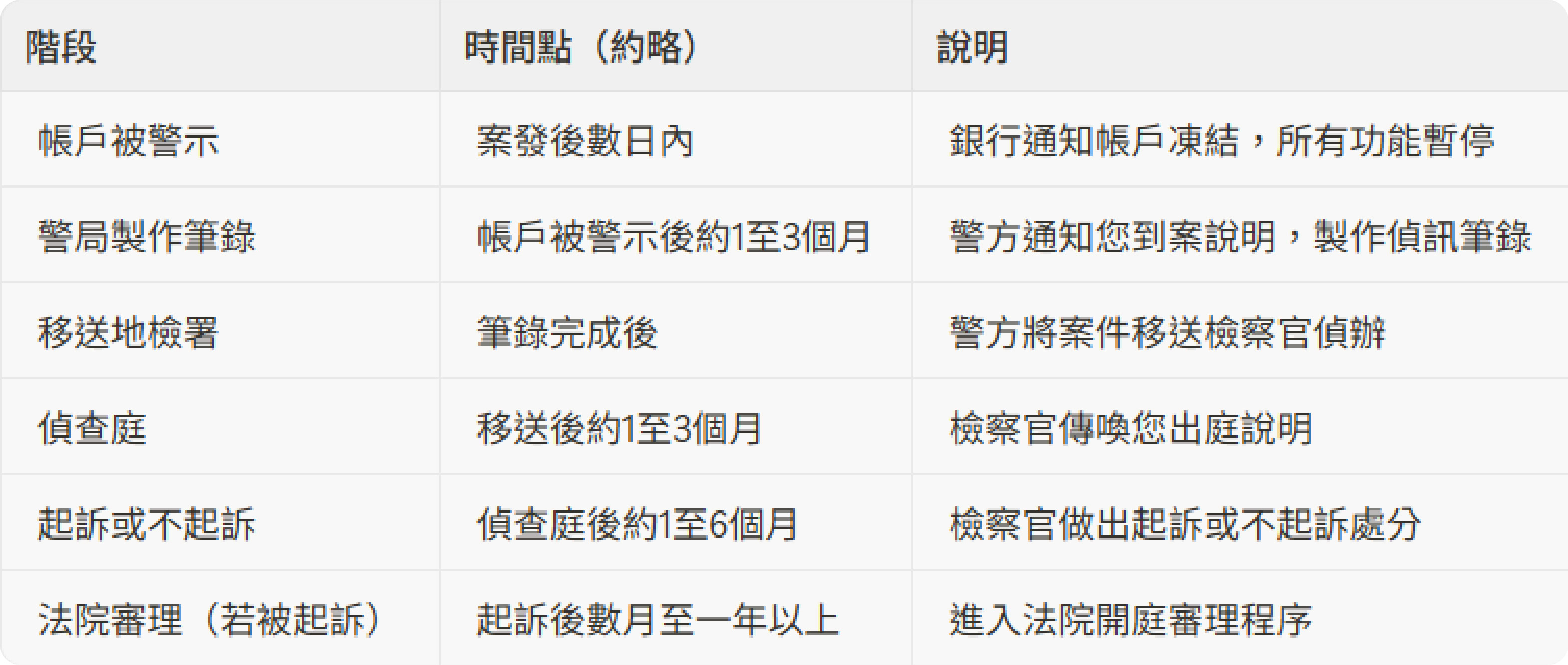 從這張時間表您可以清楚看到,帳戶被警示只是整個司法程序的「起點」,後面還有筆錄、偵查庭、起訴與否的判斷,甚至可能進入法院審理階段。如果您在一開始就抱持「不會開庭」、「做完筆錄就會沒事」的心態,不僅會錯失建立正確辯護策略的黃金時機,更可能因為在筆錄中做出不利於自己的陳述,而讓整個案件走向無法挽回的結果。