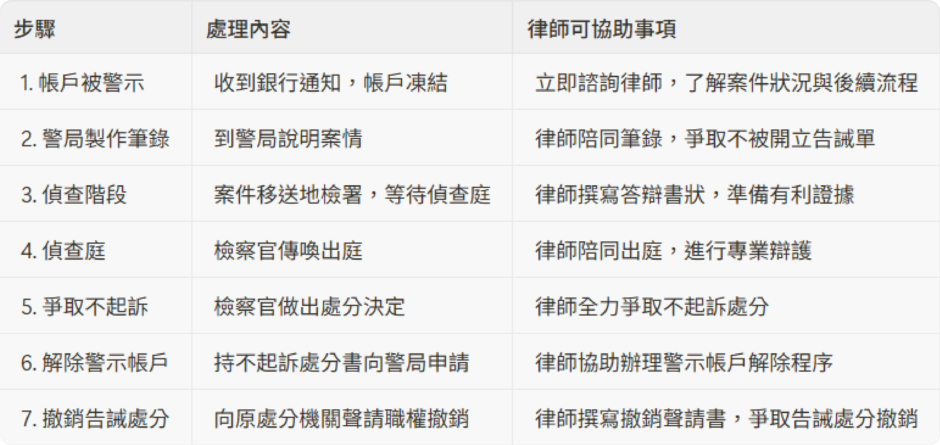 為了讓您更清楚地掌握整個案件的應對節奏,以下為您整理從帳戶被警示到最終解除的完整處理流程: