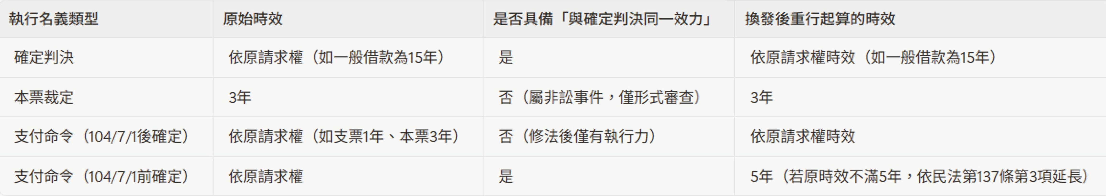 更複雜的是,重行起算的時效長度,會因當初取得的執行名義種類而有天壤之別。以下是各類執行名義對應的時效整理: