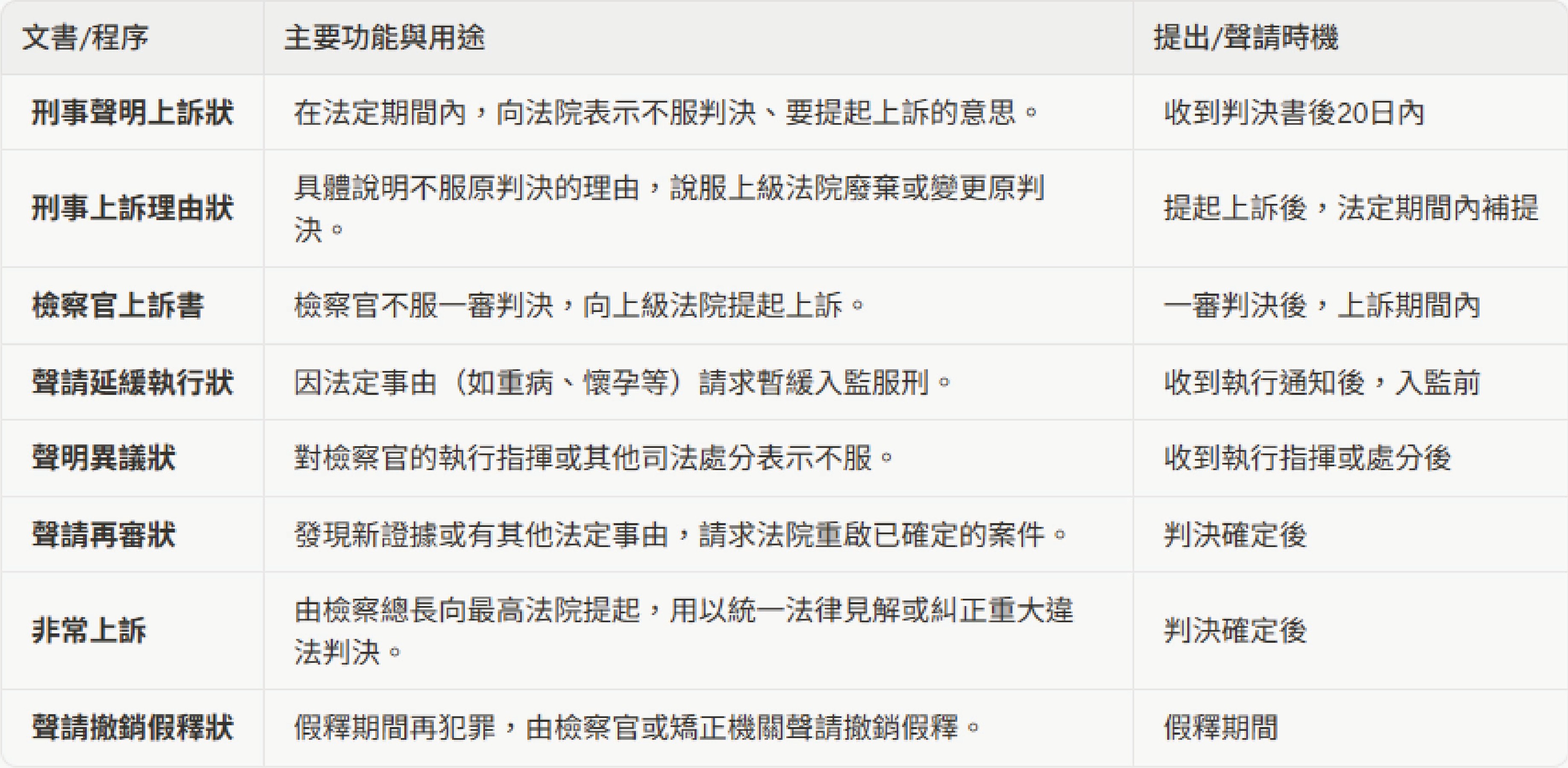 • 聲請延緩執行狀:當案件判決確定,被告需入監服刑時,若有刑事訴訟法第 467 條所規定的情形,例如心神喪失、懷胎五月以上、或罹患重病可能因執行而有生命危險等,可以向檢察官提出「聲請延緩執行狀」,請求暫緩執行。