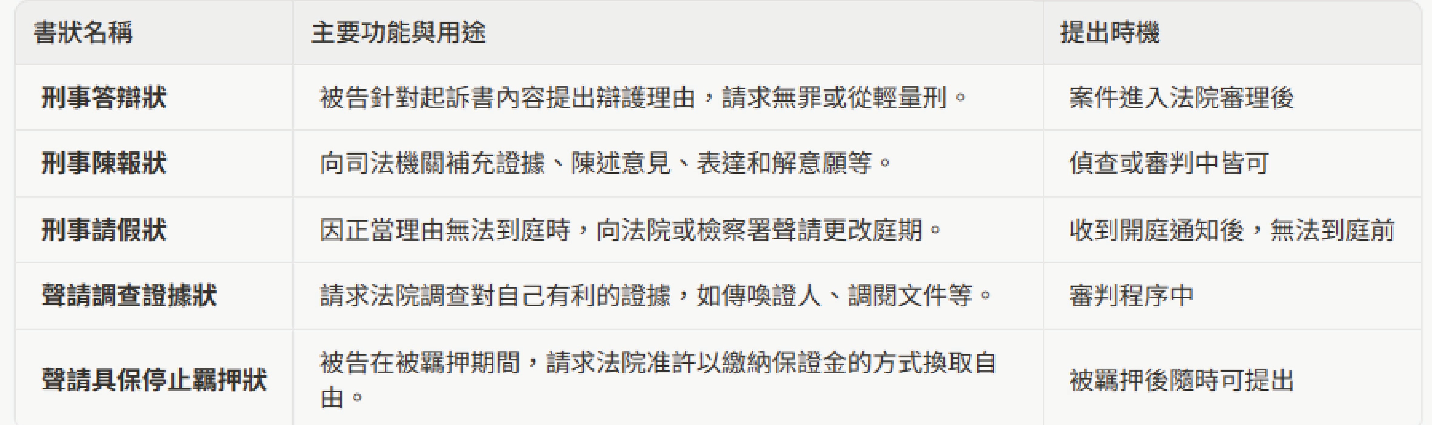 在刑事程序中,被告或相關當事人可以透過提交書狀來向法院或檢察署表達意見、聲請權利。以下介紹幾種常見的書狀: