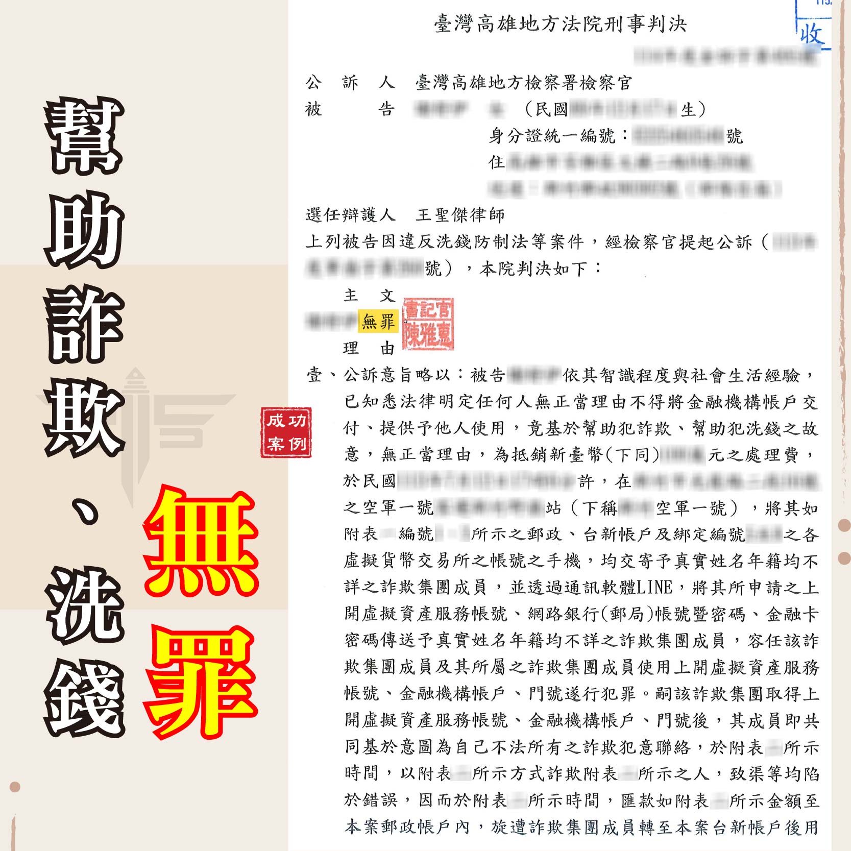 經過高雄地方法院的審理,法官最終全面採納了謙聖國際法律事務所的辯護意見。判決書中明確指出,本案是詐騙集團精心設計的騙局,A先生主觀上並未預見其帳戶會被用於詐欺,更無從獲致有罪之心證。因此,基於「罪疑唯輕,利歸被告」的最高原則,判決A先生無罪!當事人A先生在得知判決結果後,激動地向我們表示:「謝謝王律師,如果沒有你們,我的人生可能就毀了。」這份無罪判決,不僅是對A先生清白的最好證明,更是對謙聖國際法律事務所專業辯護能力的最高肯定。