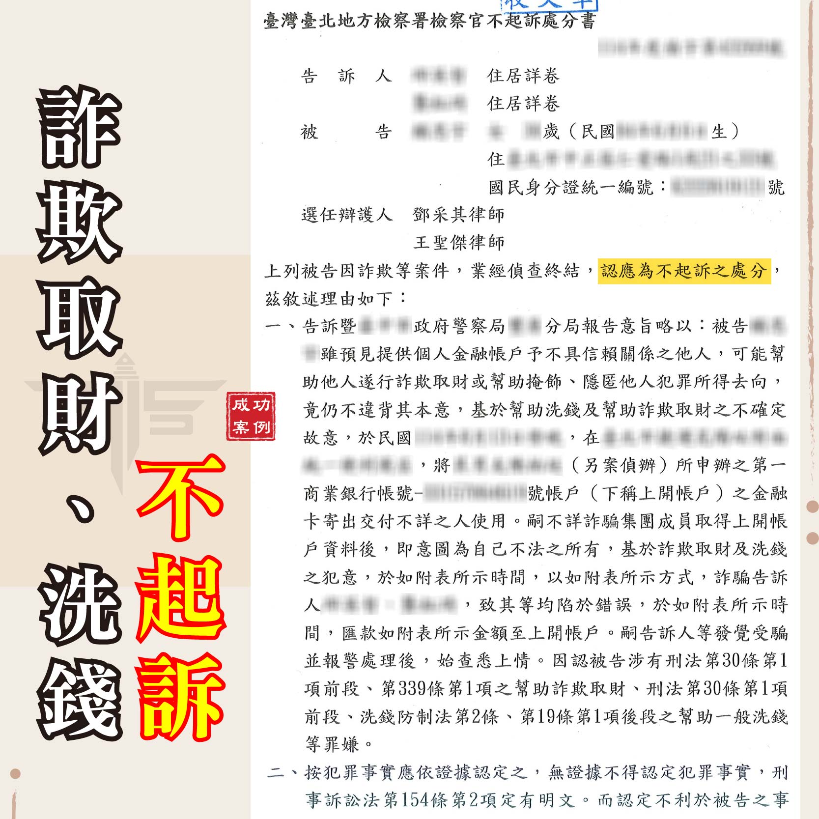 【詐欺案件不起訴】提供帳戶竟被當人頭戶?律師雙人合力成功爭取不起訴!
