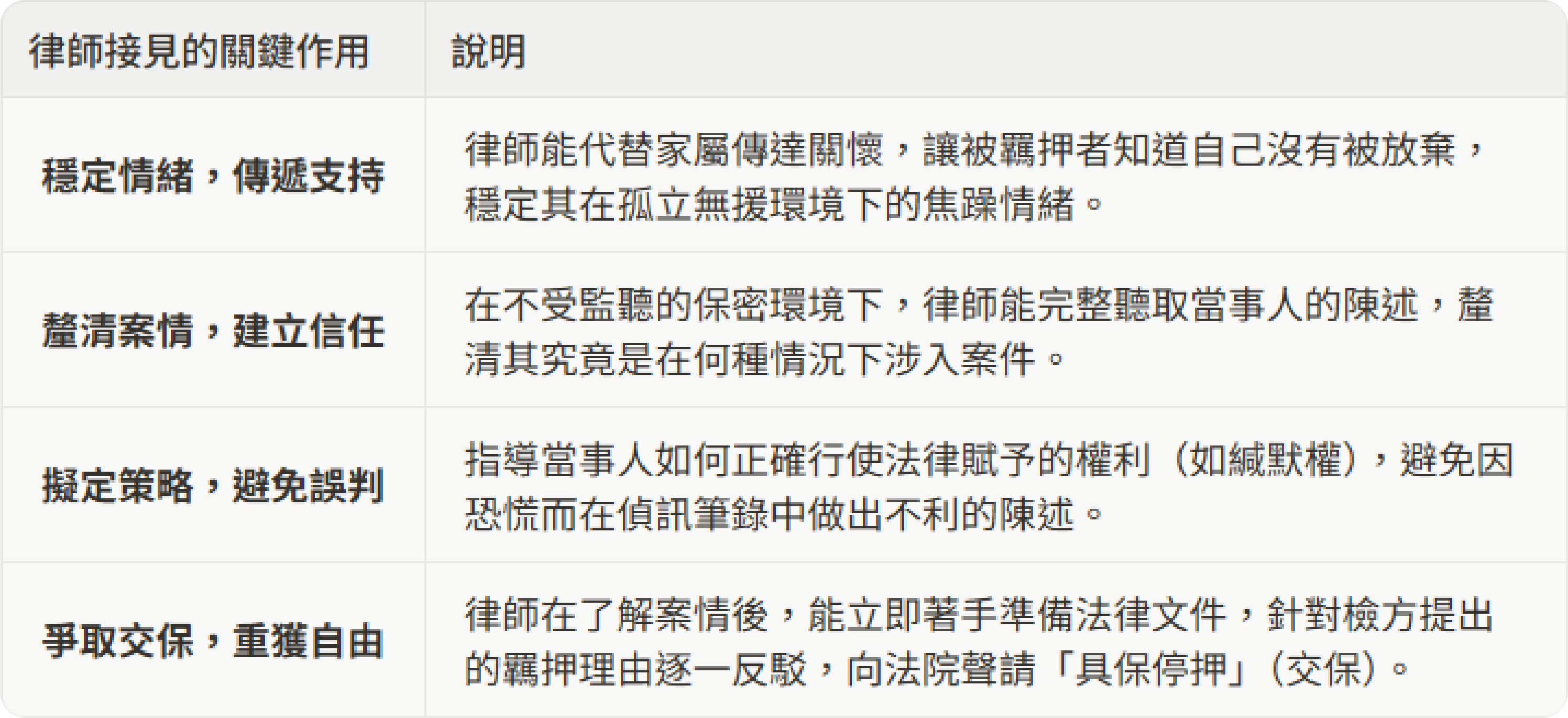 ➙重要的是,必須明白「羈押不等於判刑」。這是一個偵查過程中的強制處分,但若處理不當,極可能導致後續的訴訟結果朝不利方向發展。
