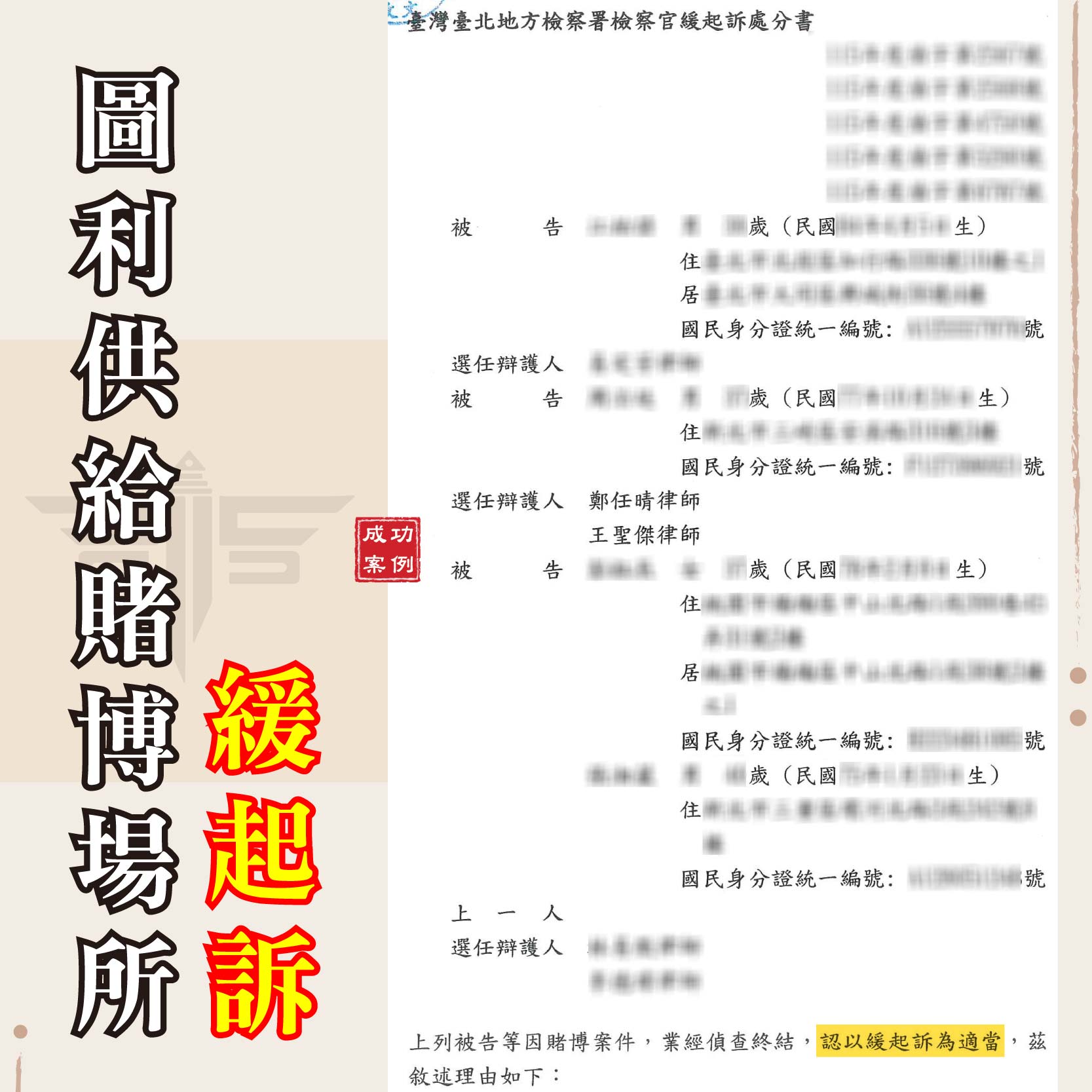 在眾人皆曰不可的太子集團案件中,當大部分被告都面臨牢獄之災的巨大壓力時,謙聖國際法律事務所憑藉著豐富的刑事辯護經驗與對案件細節的精準掌握,成功地為我們的委託人爭取到了「緩起訴」的處分。這不僅代表當事人免於被正式起訴、免於承擔刑事前科的風險,更是在這起驚天大案中,一個極其罕見且珍貴的勝利。