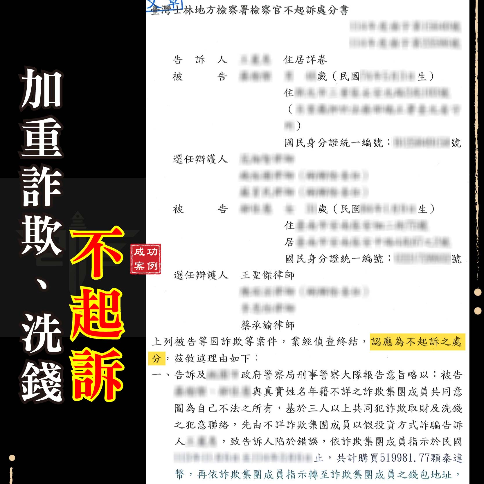 經過王聖傑律師縝密的策略佈局與法庭上的據理力爭,士林地檢署的檢察官最終採納了我們的全部主張。檢察官在不起訴處分書中明確指出: