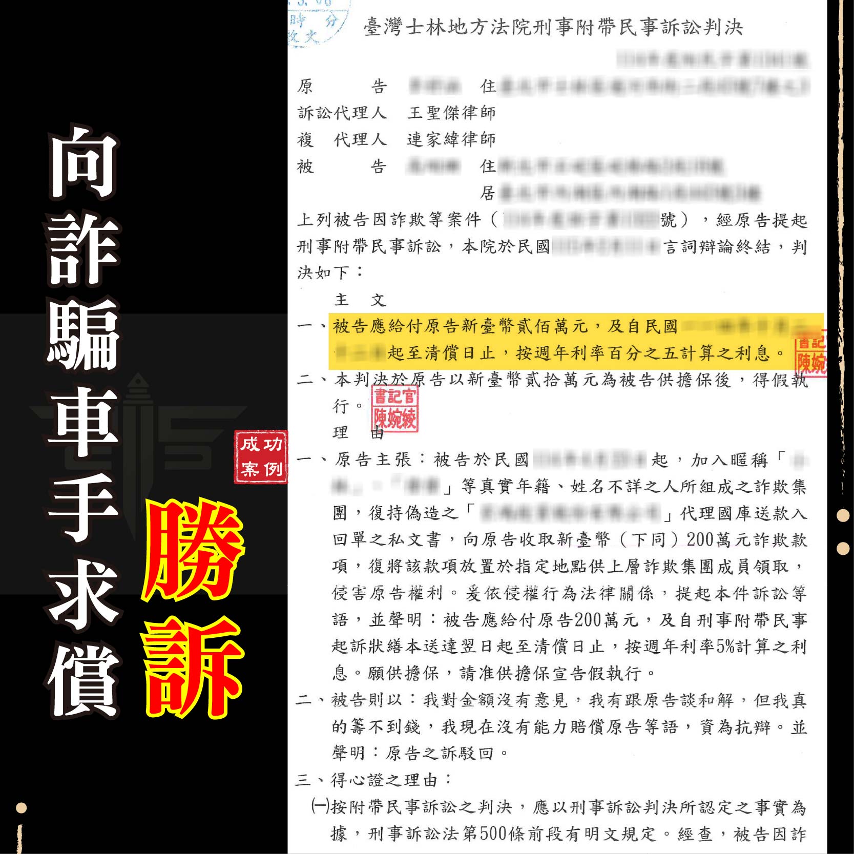 ➙這份判決的重大意義在於,它不僅僅是紙上勝利。謙聖律師團更成功地為當事人爭取到極為有利的「假執行」條件。依據最新的《詐欺犯罪危害防制條例》第 54 條,詐欺案被害人聲請假執行的擔保金,不得高於請求金額的十分之一。這意味著,Ms. A 僅需拿出 20 萬元作為擔保,就可以立刻聲請法院強制查封、拍賣車手 Ms. B 名下的財產,有效防止對方脫產,確保最終能拿回賠償。